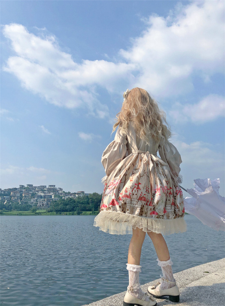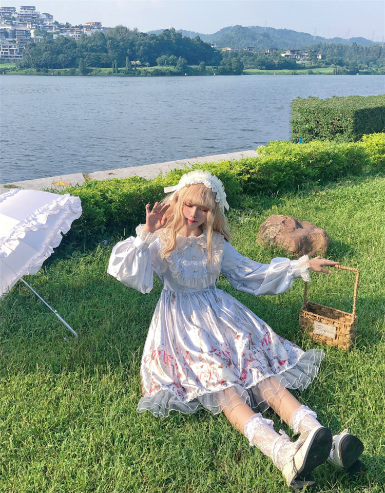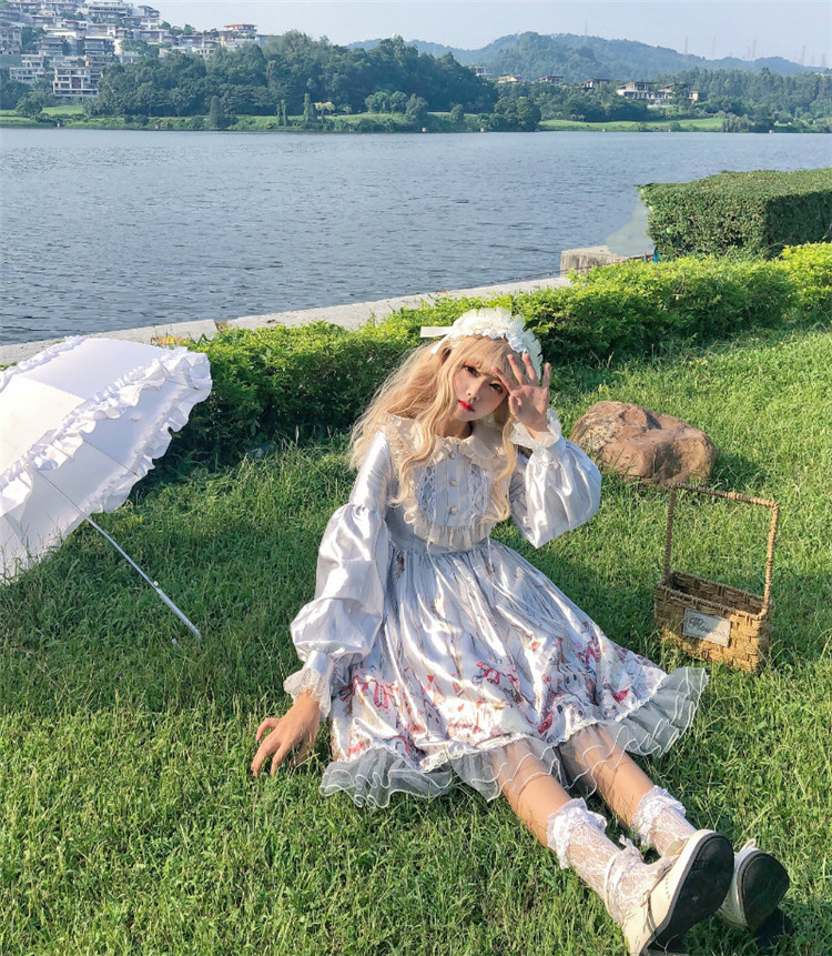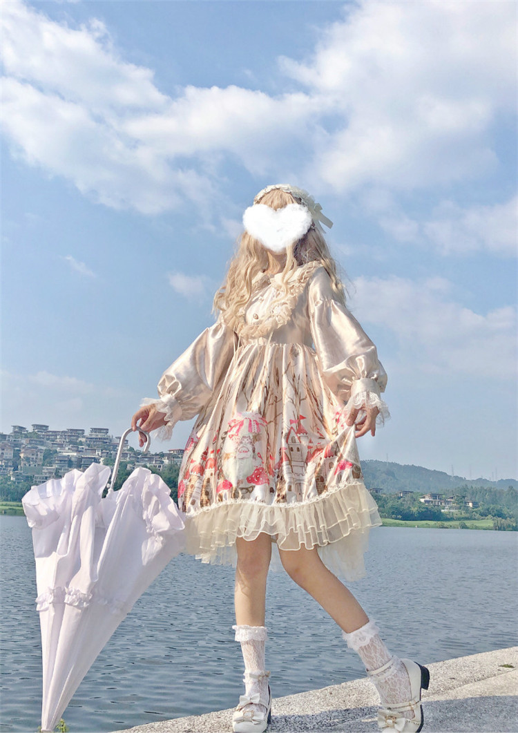 商品名 ロリータ ワンピース レディース 長袖 ワンピ つや ボリューム袖 総柄 膝下 フリル 萌え 甘ロリ かわいい