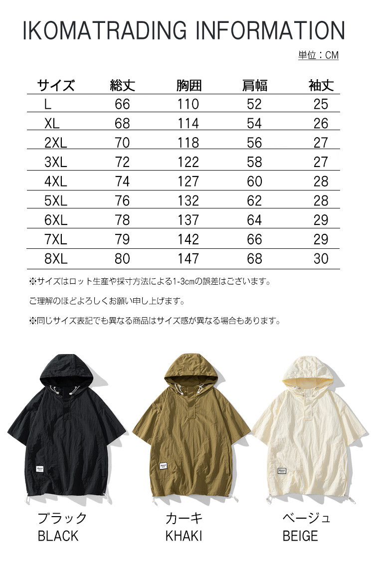 ※お取り扱い前に、商品付属タグの記載もご確認下さい。商品情報商品名 半袖パーカー メンズ レディース ユニセックス パーカー ハーフジップ ナイロン パーカー 半袖 五分袖素材 ポリエステルカラー ブラック(black)|ベージュ(biege)|カーキ(khaki)サイズ L|XL|2XL|3XL|4XL|5XL|6XL|7XL|8XL生産国 中国包装について 環境保護の観点から、「簡易包装」を推進しております明細書について 当店ではエコロジーと個人情報流出防止のため、ご指示の無い限り明細書を発行しておりません。