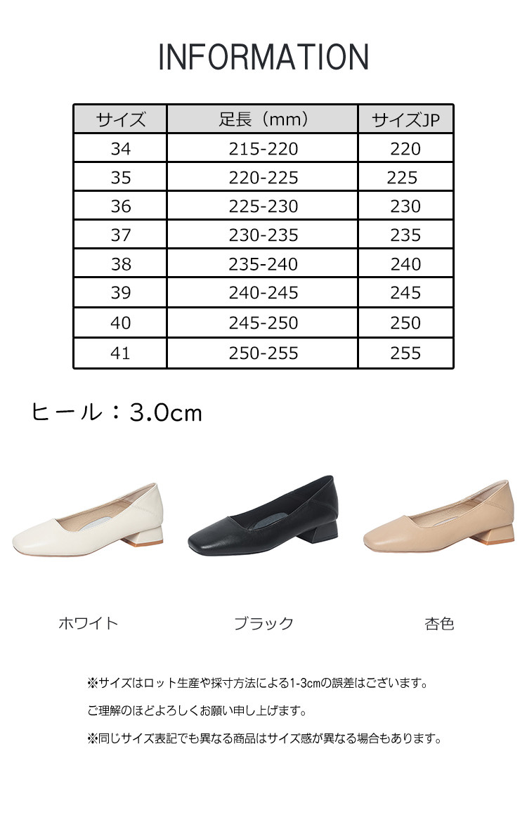 ※お取り扱い前に、商品付属タグの記載もご確認下さい。商品情報商品名 パンプス レディース 本革 シューズ ローヒール スクエア 春夏 無地 柔らかい 痛くない シンプル オフィス素材 本革カラー ブラック|杏色|ホワイトサイズ 34|35|36|37|38|39|40|41生産国 中国包装について 環境保護の観点から、「簡易包装」を推進しております明細書について 当店ではエコロジーと個人情報流出防止のため、ご指示の無い限り明細書を発行しておりません。
