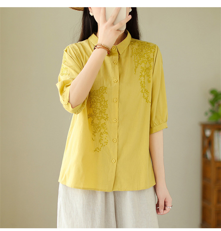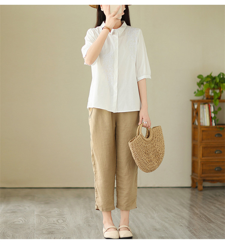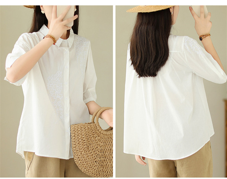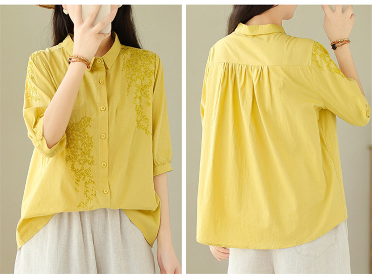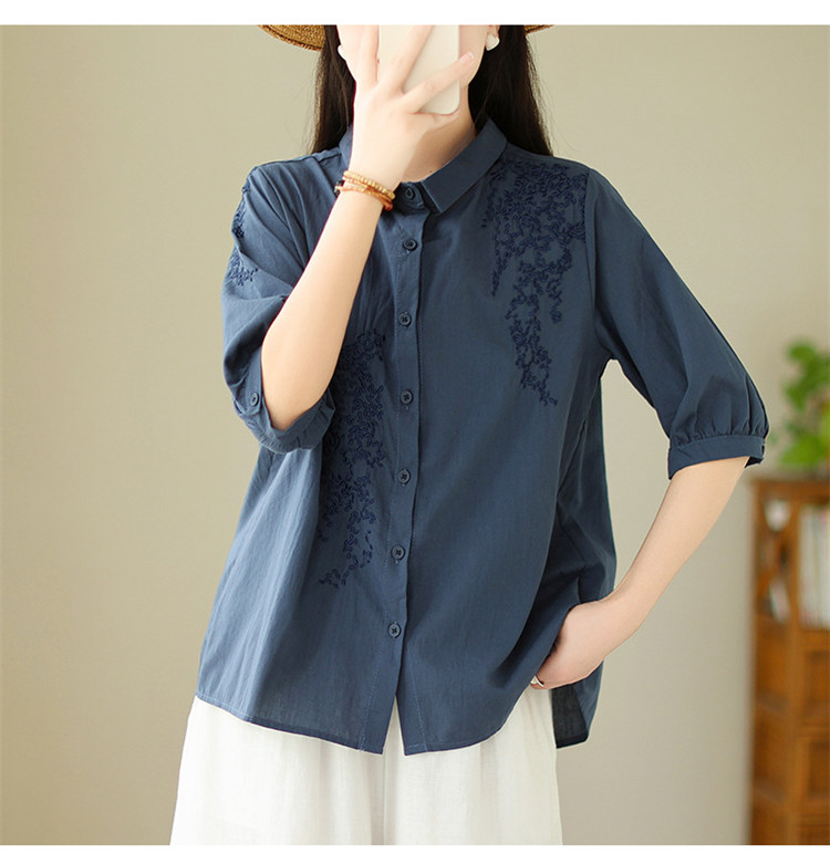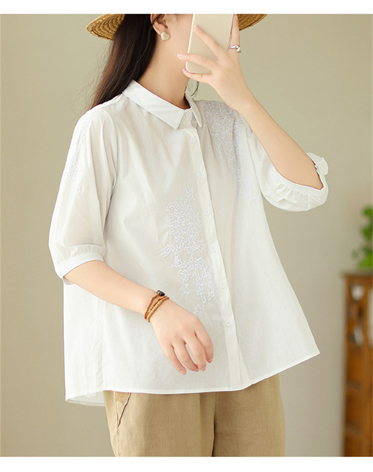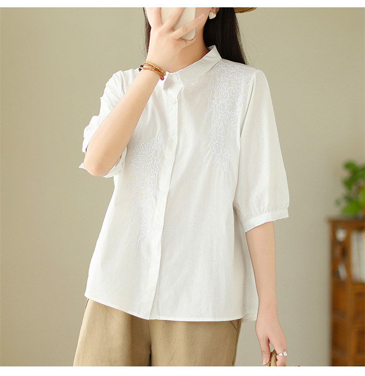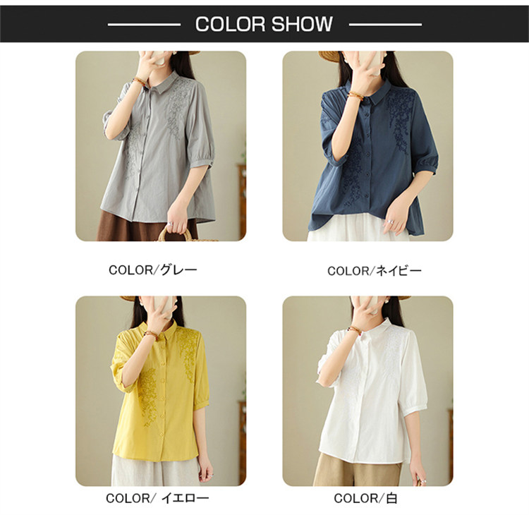 商品名 ブラウス レディース 五分袖シャツ 無地 刺しゅう 夏 トップス バックギャザー 通勤 綿 麻 夏服 五分袖 母の日 プレゼント 仕事 刺繍 襟付き ゆったり きれいめ カジュアル 可愛い オフィス ママ 夏物 30代 40代 50代 大きいサイズ おしゃれ 薄手 ファッション