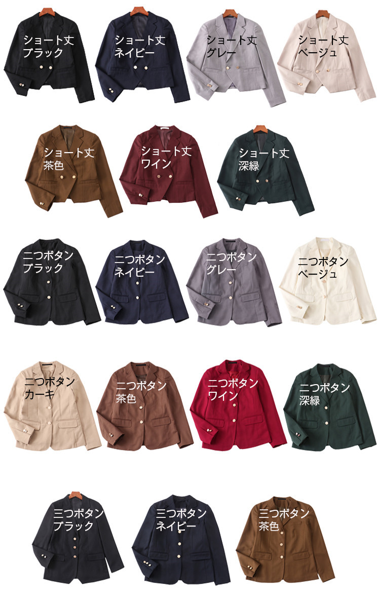 カラー: ショート丈黒 ショート丈ネイビー ショート丈グレー ショート丈ベージュ ショート丈茶色 ショート丈ワイン ショート丈深緑 二つボタン黒 二つボタンネイビー 二つボタングレー 二つボタンベージュ 二つボタンカーキ 二つボタン茶色 二つボタンワイン 二つボタン深緑 三つボタン黒 三つボタンネイビー 三つボタン茶色