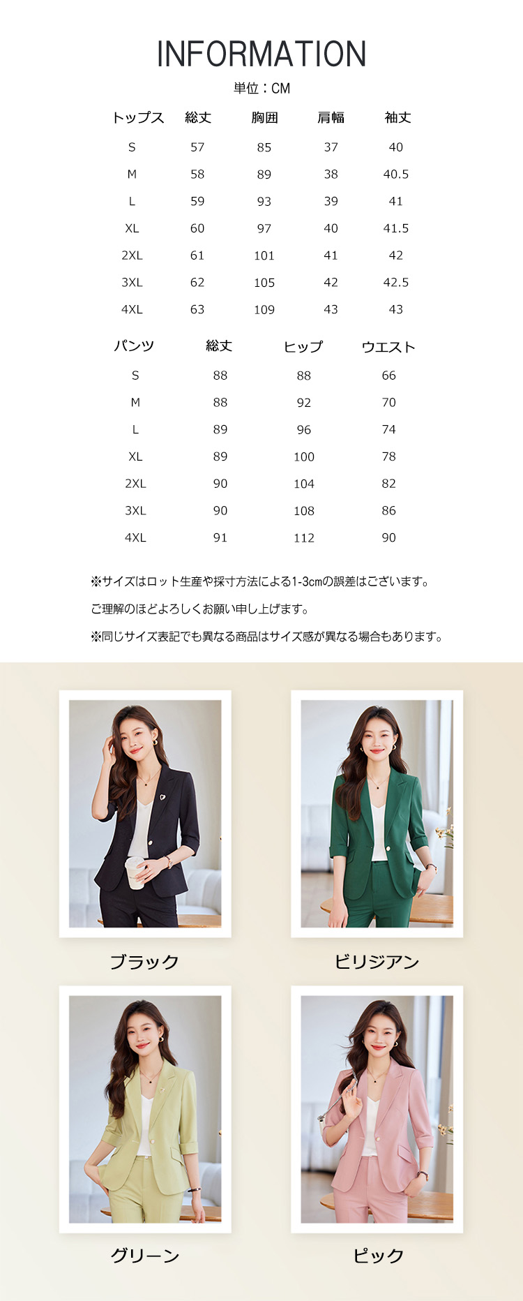 ※お取り扱い前に、商品付属タグの記載もご確認下さい。商品情報商品名 スーツ 2点セット レディース フォーマルスーツ パンツスーツ 七分袖 ジャケット 九分丈 パンツ カジュアル素材 ポリエステルカラー ブラックジャケット|ビリジアンジャケット|グリーンジャケット|ピンクジャケット|ブラックセット|ビリジアンセット|グリーンセット|ピンクセットサイズ S|M|L|XL|2XL|3XL|4XL生産国 中国包装について 環境保護の観点から、「簡易包装」を推進しております明細書について 当店ではエコロジーと個人情報流出防止のため、ご指示の無い限り明細書を発行しておりません。