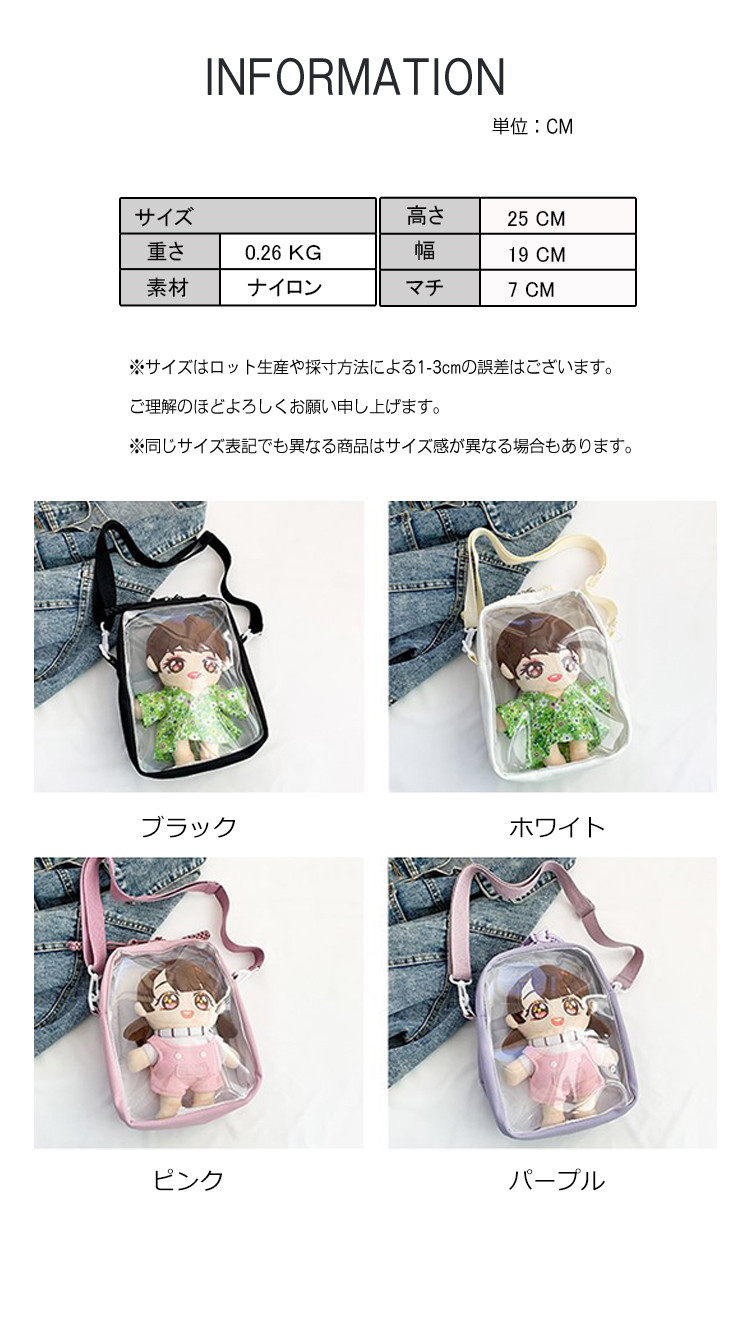 ※お取り扱い前に、商品付属タグの記載もご確認下さい。商品情報商品名 痛バッグ 小さめ ぬいぐるみ ショルダーバッグ ビニールバッグ 鞄 カバン 推しバッグ 缶バッチ 御宅 ヲタ素材 ナイロンカラー ブラック|ホワイト|ピンク|パープルサイズ F生産国 中国包装について 環境保護の観点から、「簡易包装」を推進しております明細書について 当店ではエコロジーと個人情報流出防止のため、ご指示の無い限り明細書を発行しておりません。