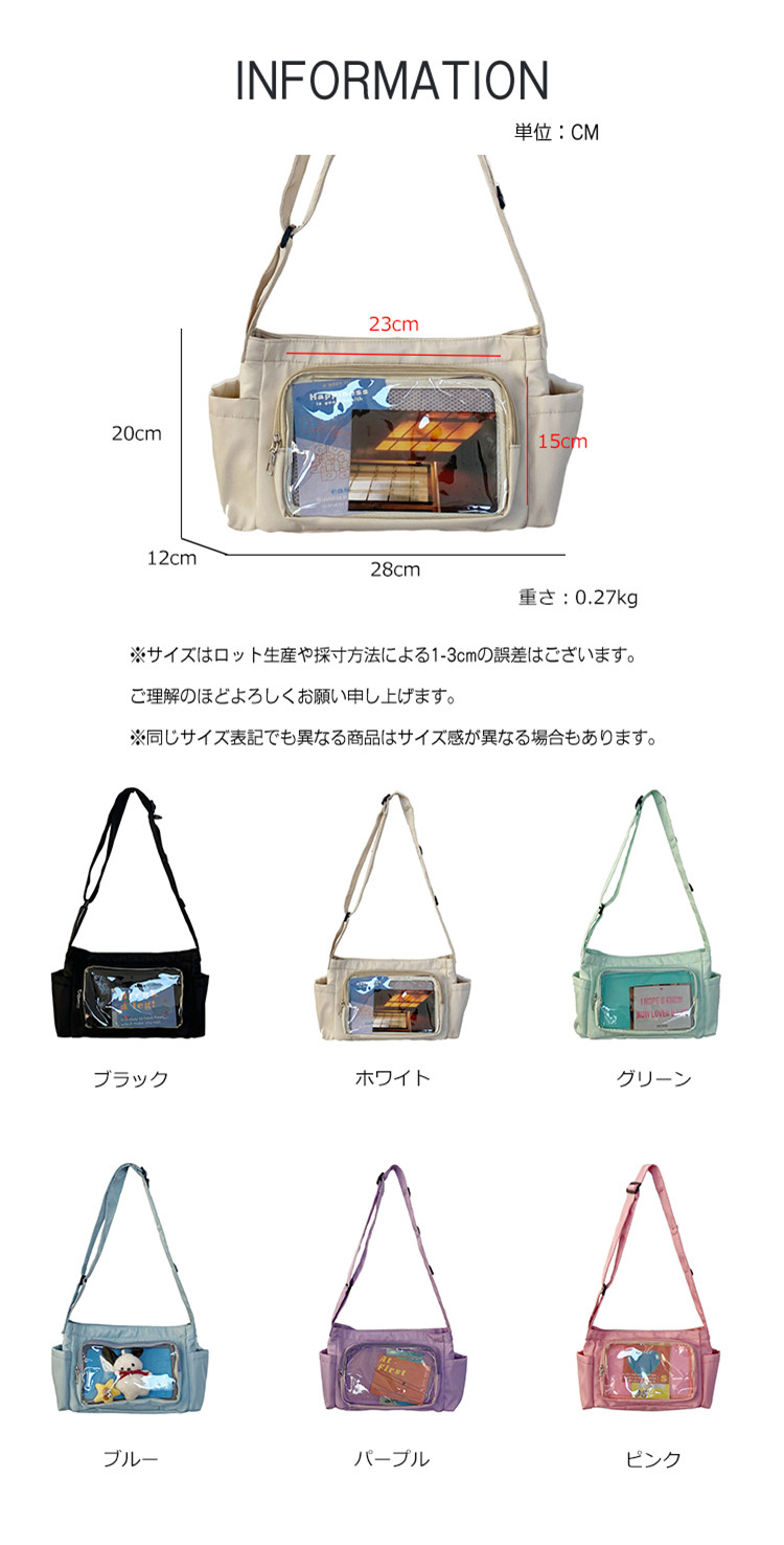 ※お取り扱い前に、商品付属タグの記載もご確認下さい。商品情報商品名 痛バッグ レディース ショルダーバッグ 大容量 缶バッチ クリアバッグ 痛バック 痛バ カジュアル おしゃれ素材 ナイロンカラー ブラック|ホワイト|グリーン|ブルー|パープル|ピンクサイズ F生産国 中国包装について 環境保護の観点から、「簡易包装」を推進しております明細書について 当店ではエコロジーと個人情報流出防止のため、ご指示の無い限り明細書を発行しておりません。