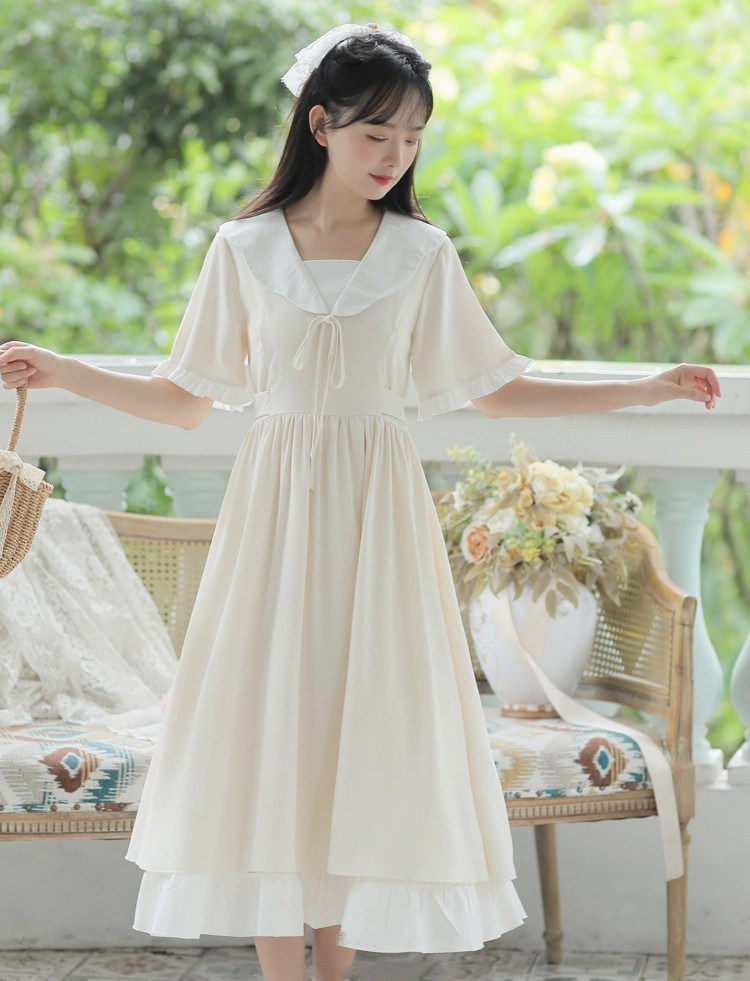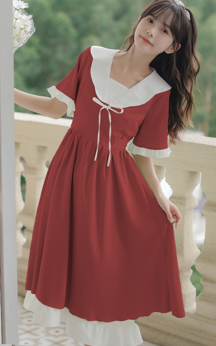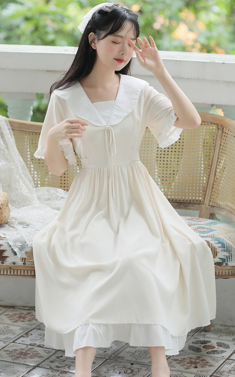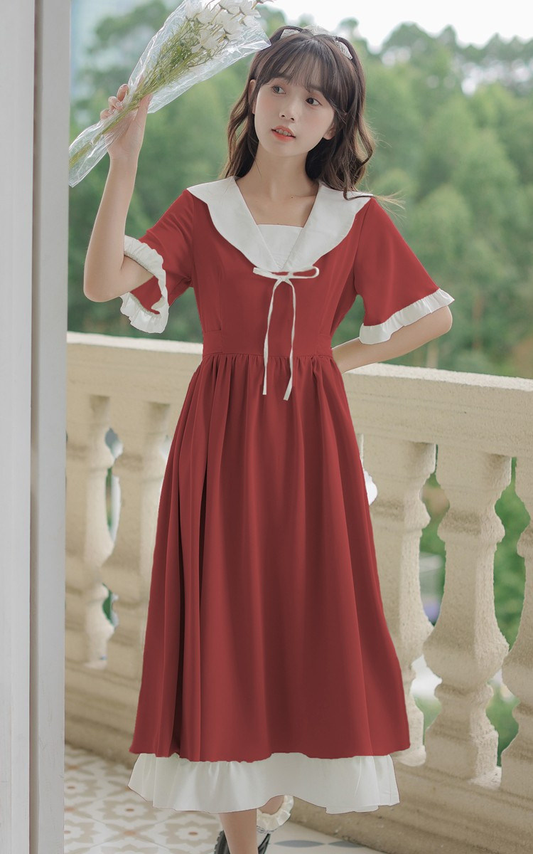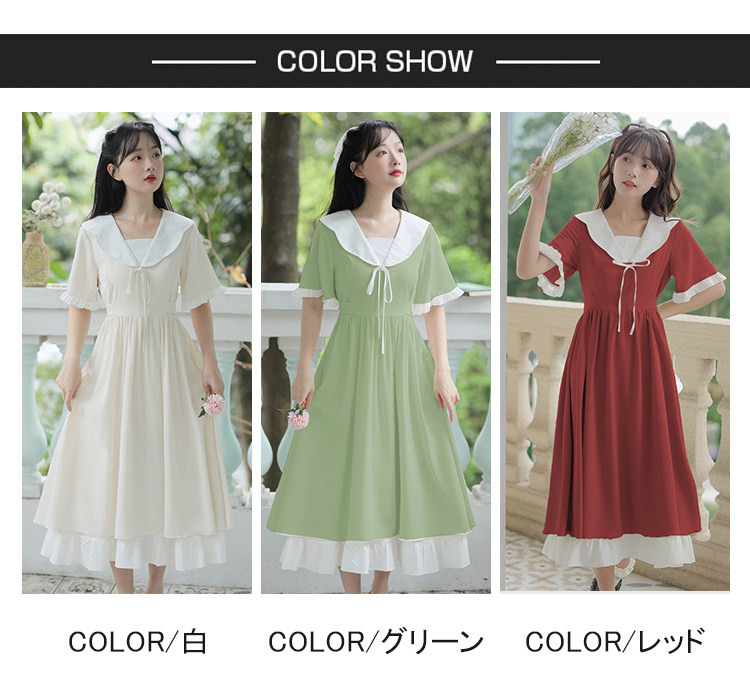 商品名 ワンピース レディース セーラー風 きれいめ 半袖 ロングワンピ フレアワンピ ビッグカラー 学生服 ガールズ ひざ下 マキシ丈 夏 夏服 かわいい お洒落 ウエストリボン 文化祭 学園祭 カジュアル お出かけ プレゼント 森ガール