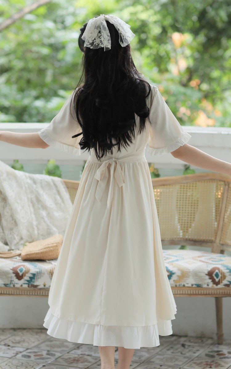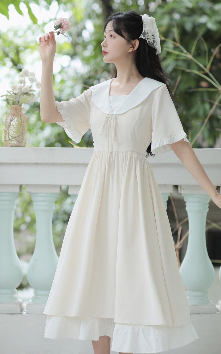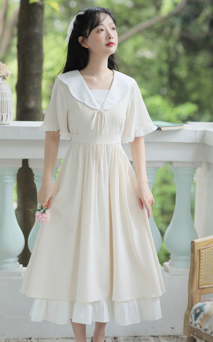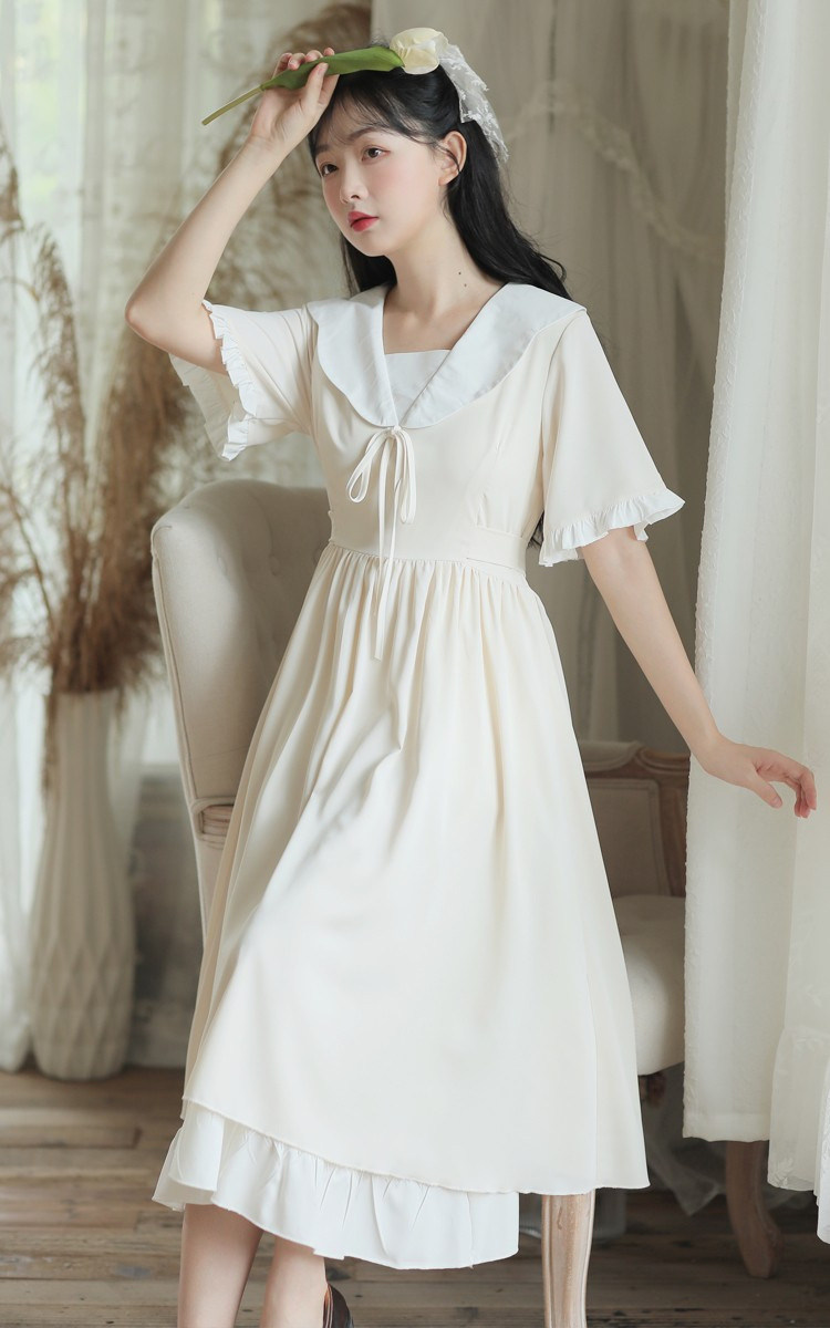 商品名 ワンピース レディース セーラー風 きれいめ 半袖 ロングワンピ フレアワンピ ビッグカラー 学生服 ガールズ ひざ下 マキシ丈 夏 夏服 かわいい お洒落 ウエストリボン 文化祭 学園祭 カジュアル お出かけ プレゼント 森ガール
