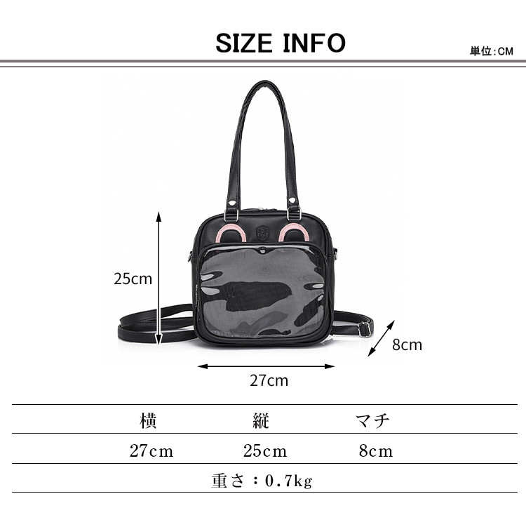 ※お取り扱い前に、商品付属タグの記載もご確認下さい。商品情報商品名 痛バッグ 2way 痛バ 配色 ショルダーバッグ ビニールバッグ レディース ガールズ 鞄 カバン かばん 可愛い素材 0カラー ブラック|ホワイト|ピンク|シルバーサイズ F生産国 中国包装について 環境保護の観点から、「簡易包装」を推進しております明細書について 当店ではエコロジーと個人情報流出防止のため、ご指示の無い限り明細書を発行しておりません。
