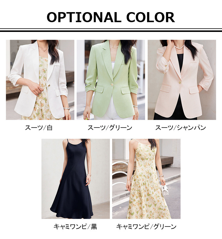 カラー ホワイトジャケット|グリーンジャケット|シャンパンジャケット|ブラックワンピース|グリーンワンピース
