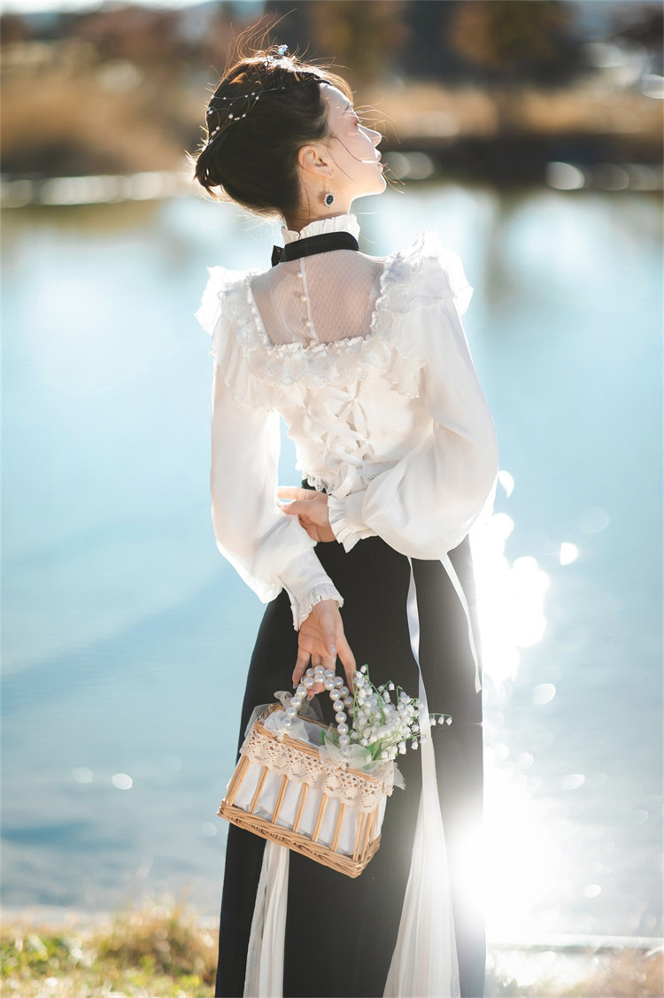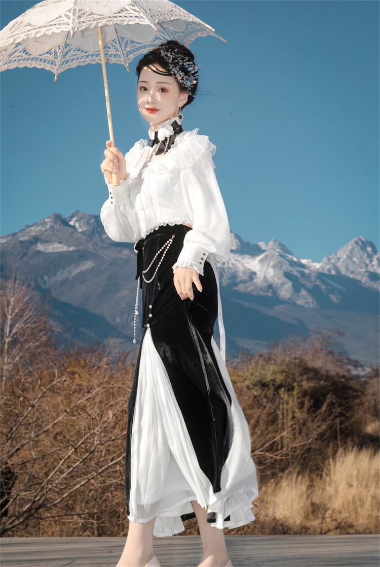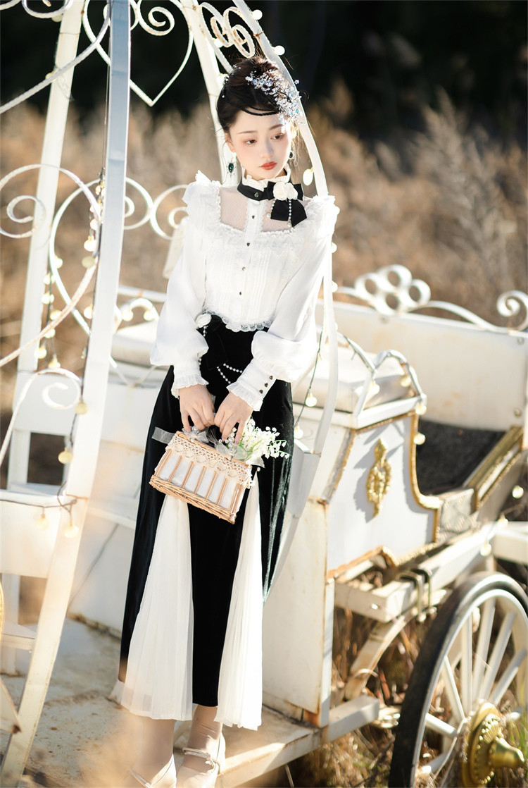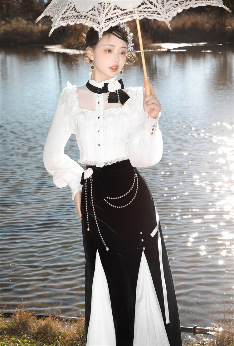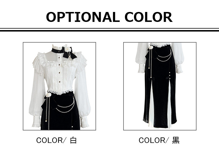商品名 ロリータ レディース 2点セット ブラウス スカート 立ち襟 フリル マーメイドスカート ピンタック 姫様