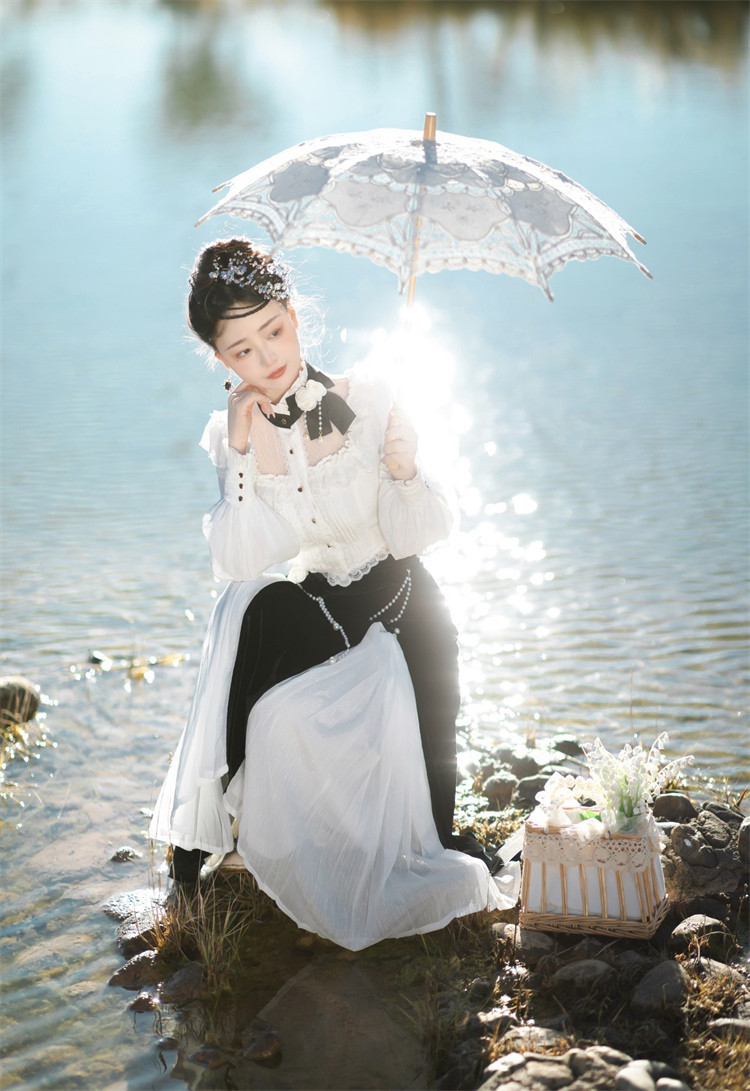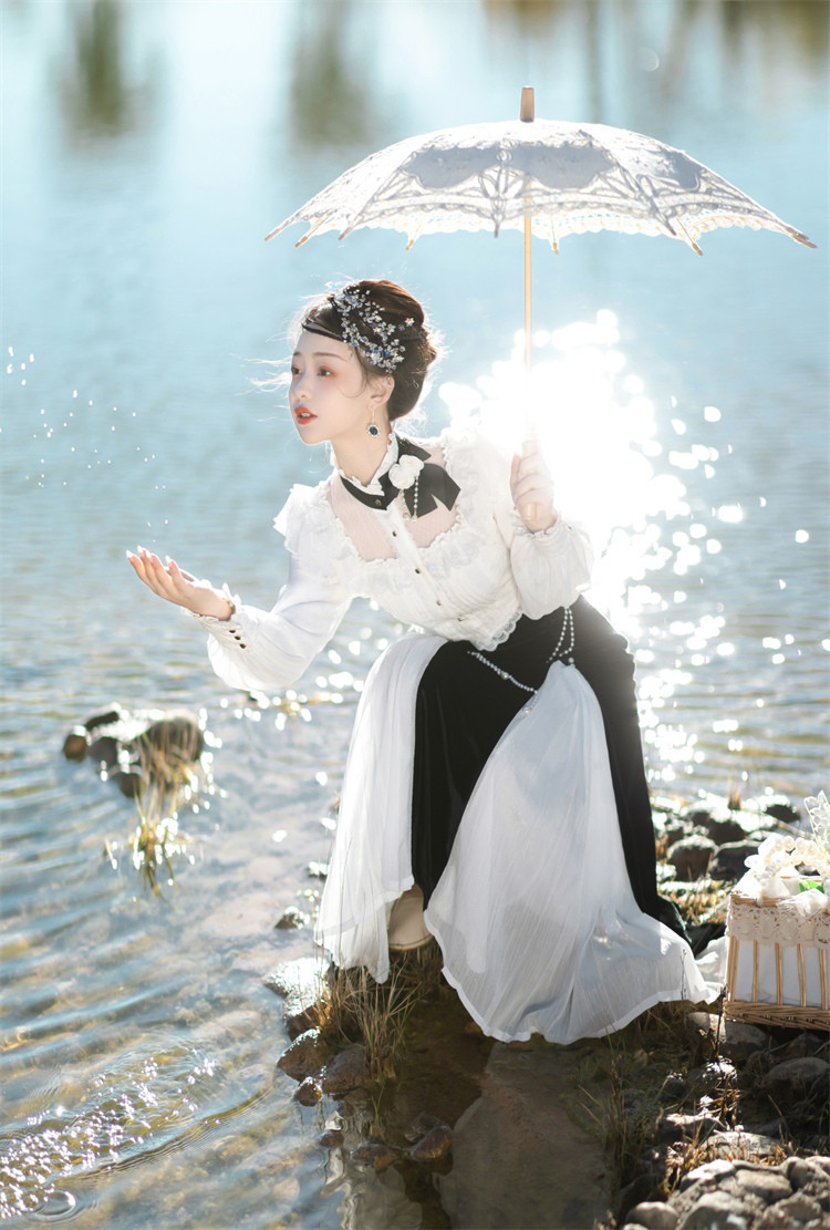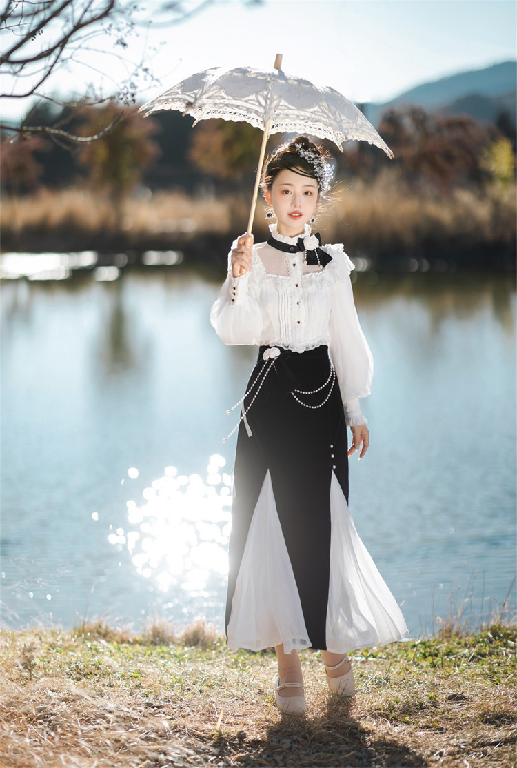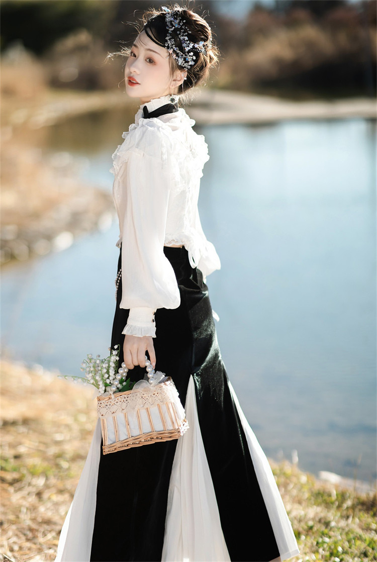 商品名 ロリータ レディース 2点セット ブラウス スカート 立ち襟 フリル マーメイドスカート ピンタック 姫様