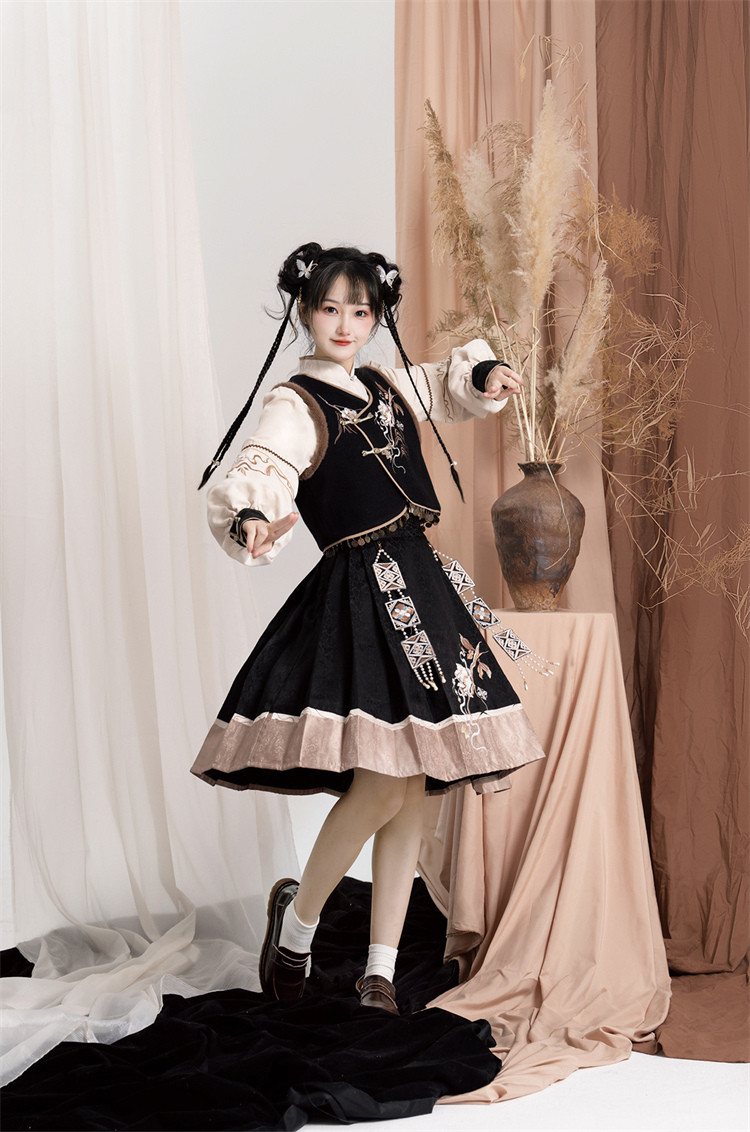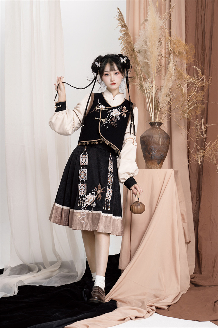 商品名 ロリータ レディース 4点セット ブラウス ベスト スカート バッグ 立ち襟 中華風 中華娘 刺しゅう かわいい