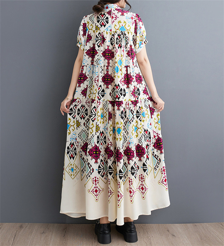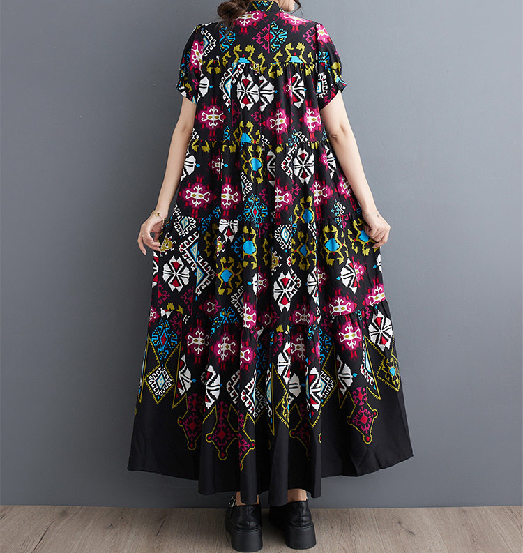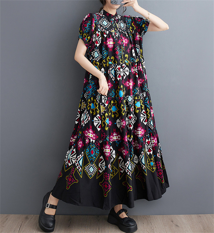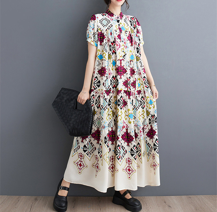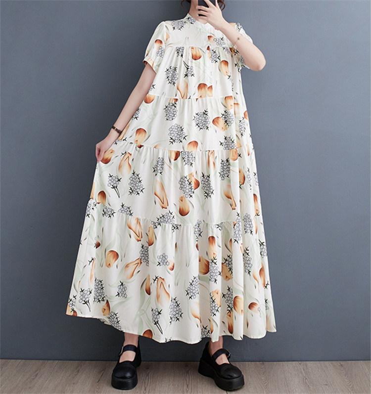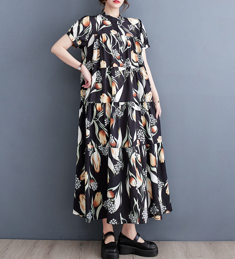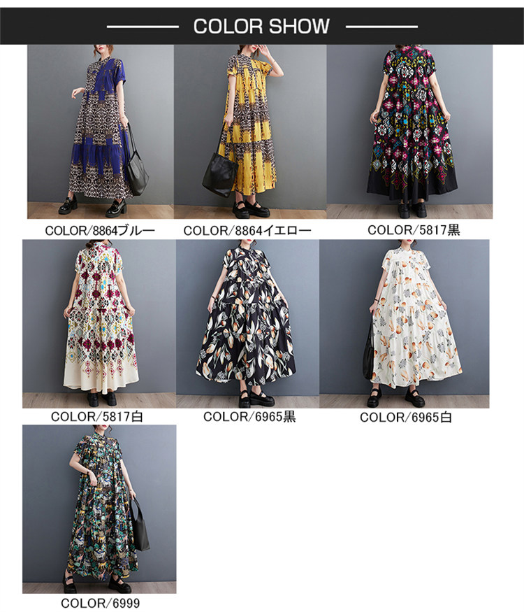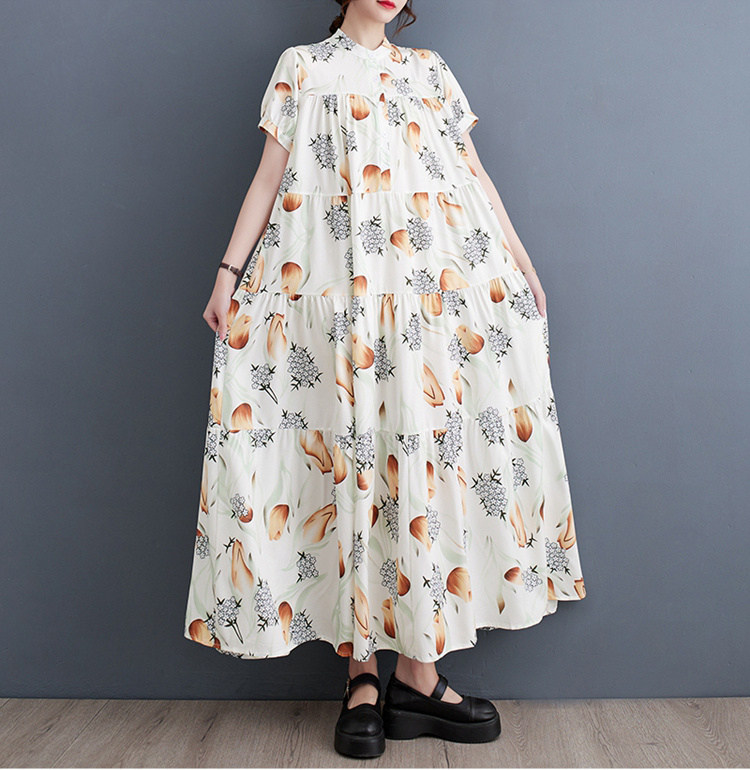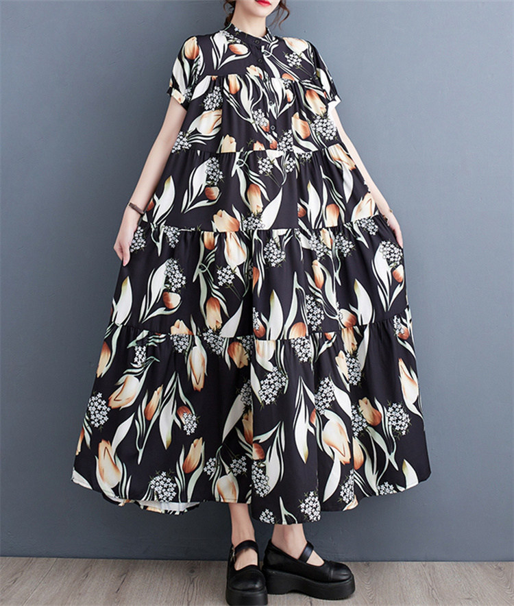 商品名 ワンピース レディース 花柄ワンピース 半袖 総柄 バンドカラー ロング丈 ビッグシルエット ハーフボタン ティアード ギャザー Aライン マキシ丈ワンピース 春 夏 ロングシャツ カジュアル ゆったり きれいめ フレア 上品 ロングワンピ 花柄 綿 体型カバー ゆるっと