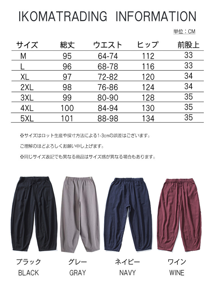 ※お取り扱い前に、商品付属タグの記載もご確認下さい。商品情報商品名 パンツ メンズ ボトムス ズボン 綿麻パンツ サルエルパンツ ワイドパンツ ロング丈 9分丈 ウエストゴム素材 ポリエステルカラー 黒(black)|グレー(gray)|ネイビー(navy)|ワイン(wine)サイズ M|L|XL|2XL|3XL|4XL|5XL生産国 中国包装について 環境保護の観点から、「簡易包装」を推進しております明細書について 当店ではエコロジーと個人情報流出防止のため、ご指示の無い限り明細書を発行しておりません。