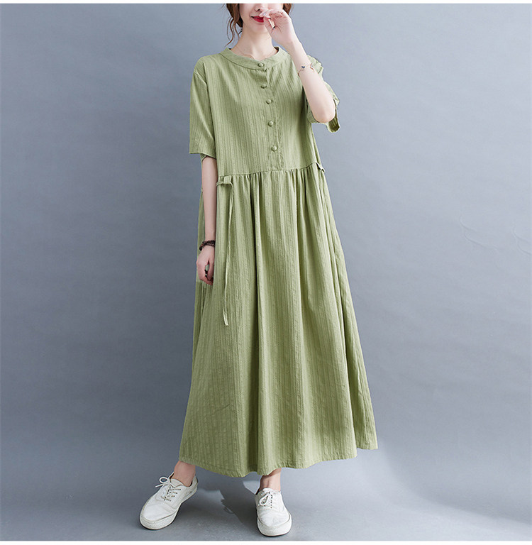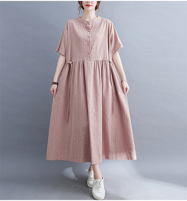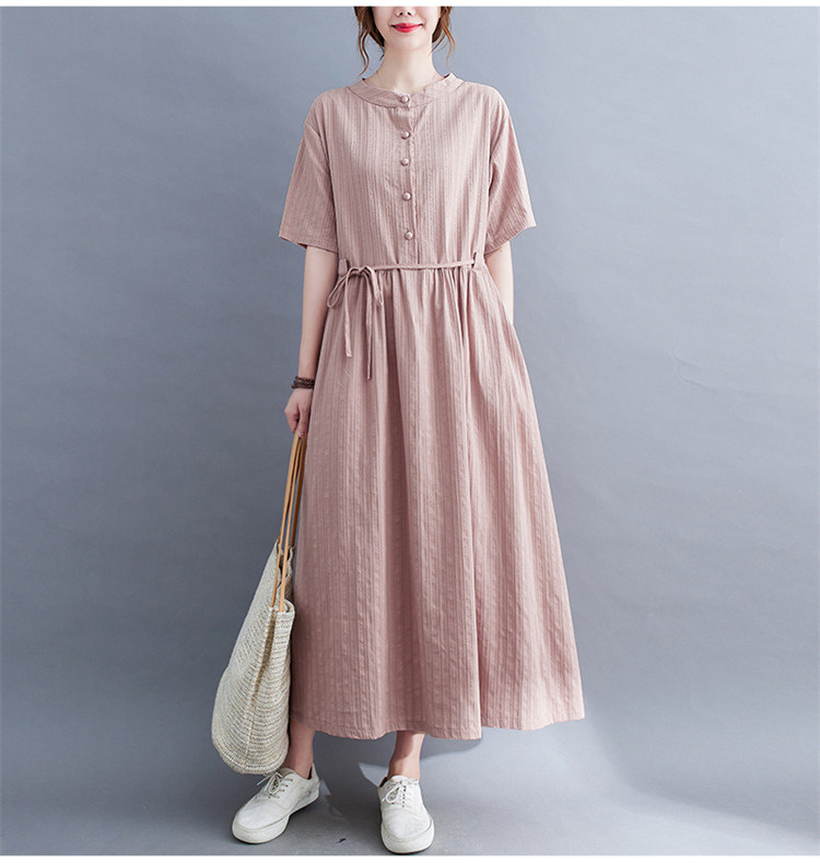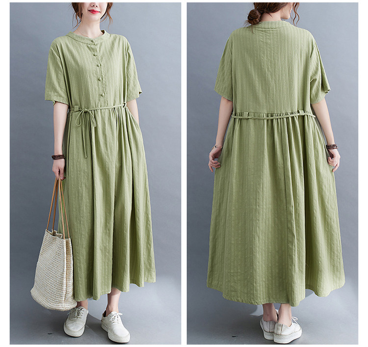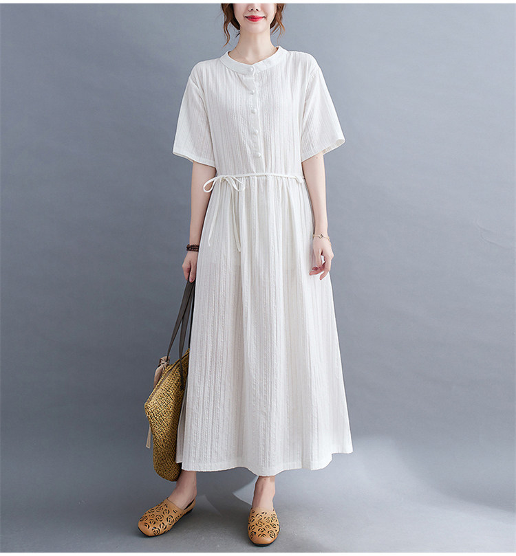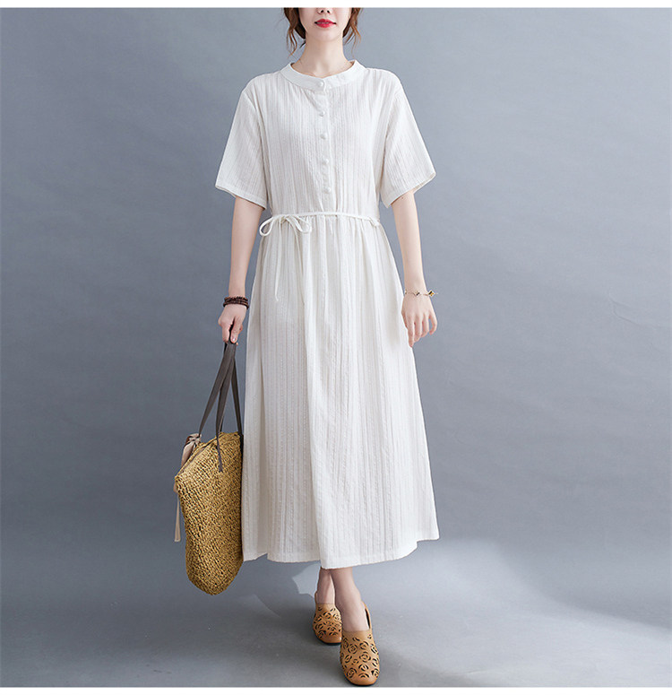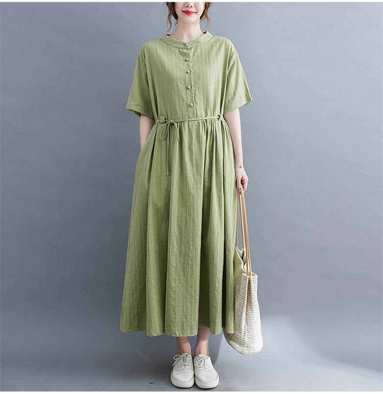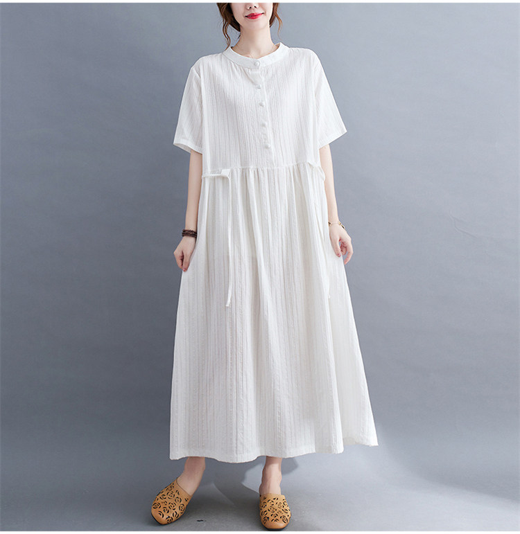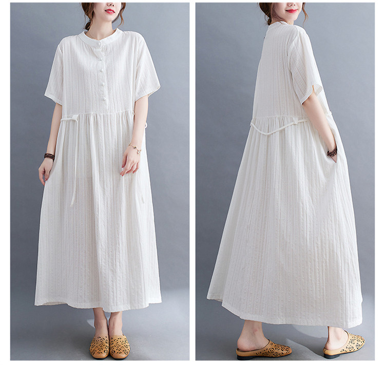 商品名 ワンピース シャツワンピース レディース 半袖 マキシ丈 春夏 綿麻 ロング丈 スタンドカラー ストライプ デザイン ゆったり マキシワンピ Aラインワンピース 大きいサイズ きれいめ 40代 30代 20代 母の日 プレゼント 通勤 仕事 ウエスト紐 体型カバー カジュアル 夏用