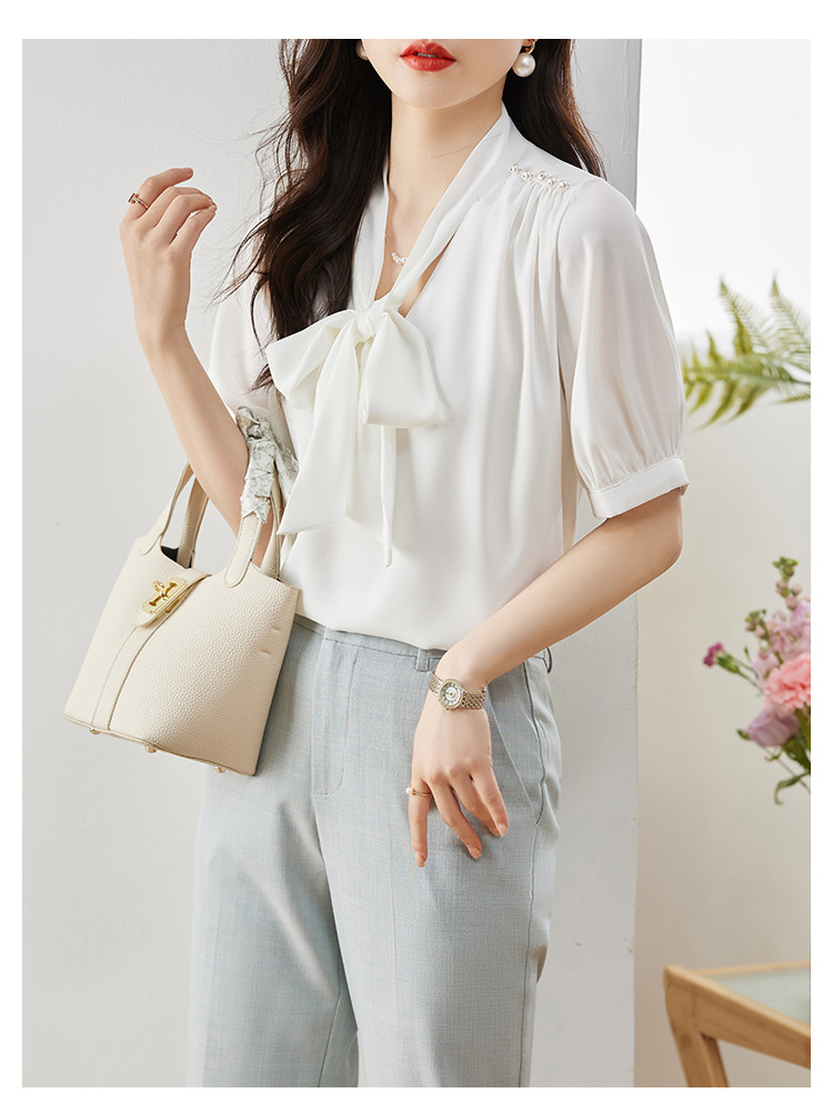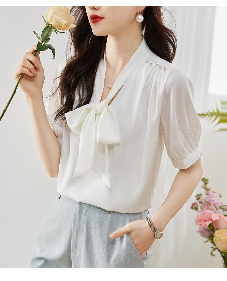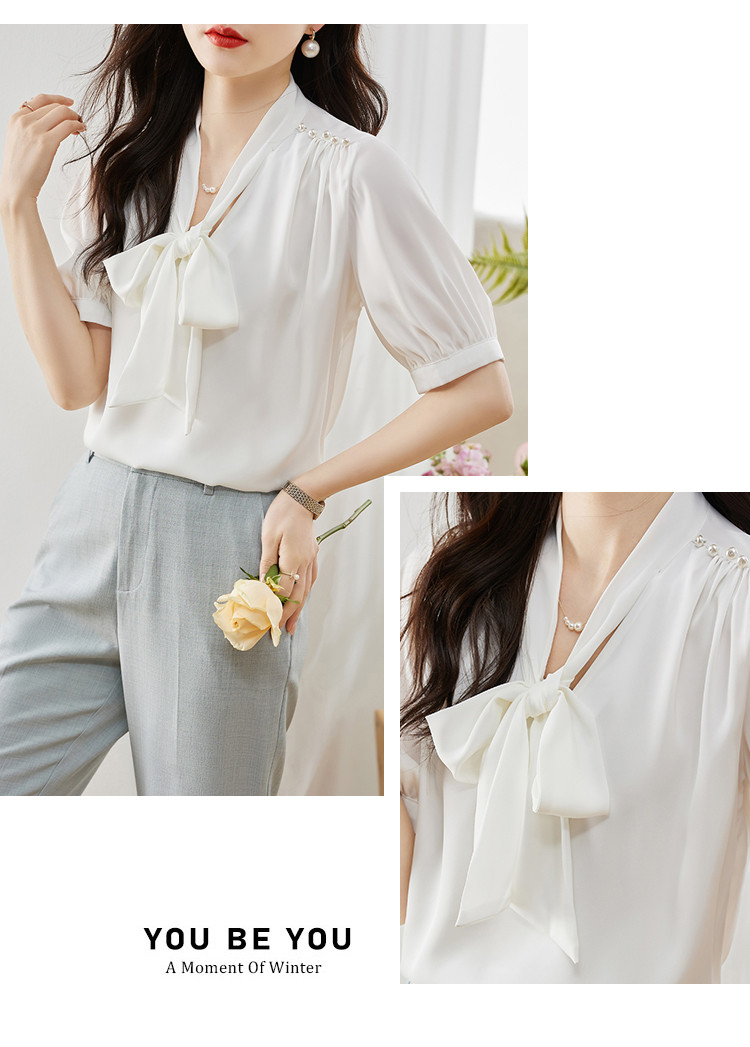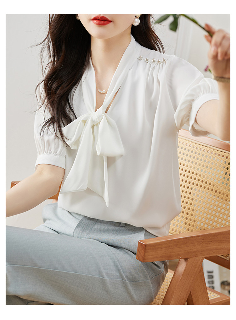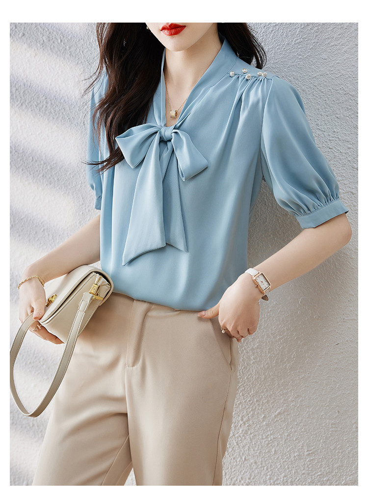 商品名 ブラウス レディース シャツ リボン vネック タック とろみ袖 無地 シンプル オフィス カジュアル 通勤