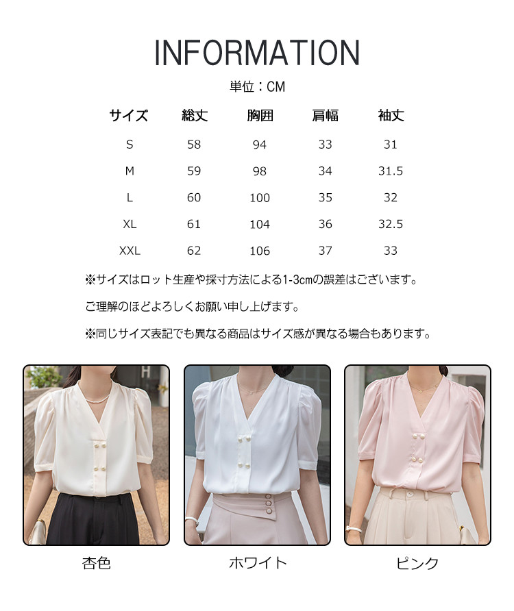 ※お取り扱い前に、商品付属タグの記載もご確認下さい。商品情報商品名 ブラウス レディース シャツ vネック ボリューム袖 プルオーバー 無地 シンプル オフィス カジュアル 通勤素材 ポリエステルカラー 杏色|ホワイト|ピンクサイズ S|M|L|XL|XXL生産国 中国包装について 環境保護の観点から、「簡易包装」を推進しております明細書について 当店ではエコロジーと個人情報流出防止のため、ご指示の無い限り明細書を発行しておりません。