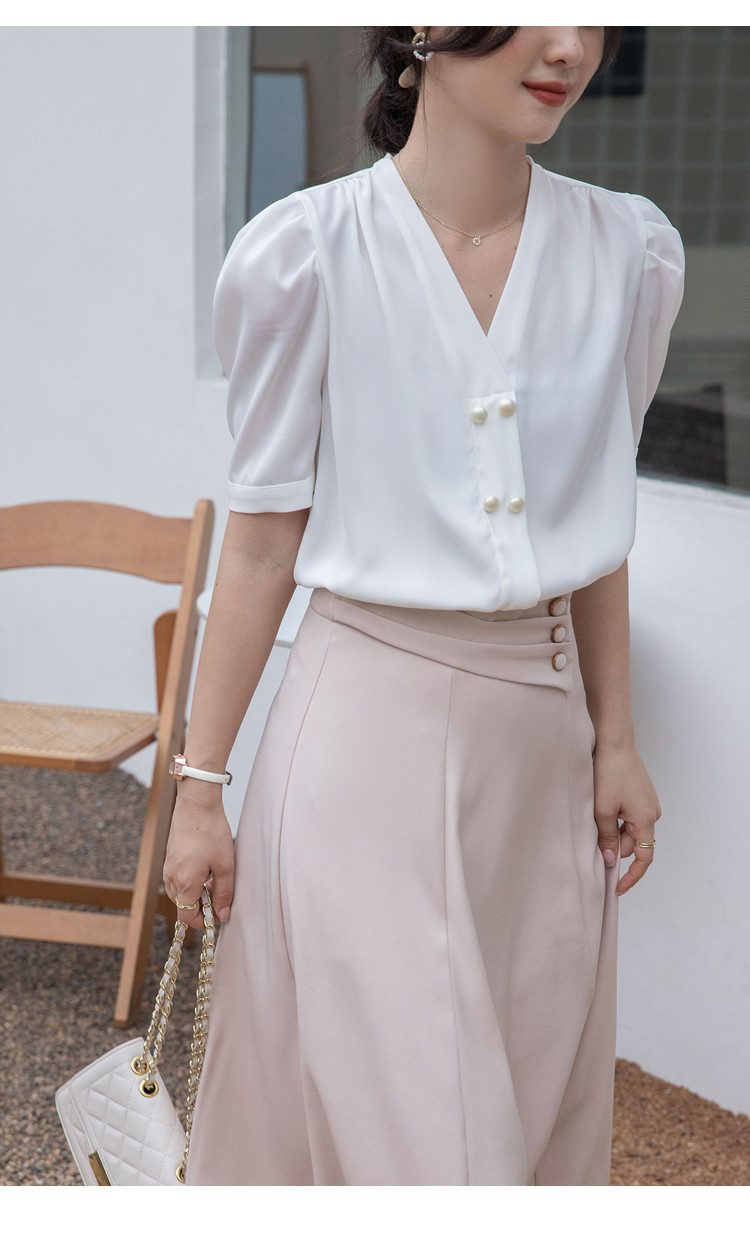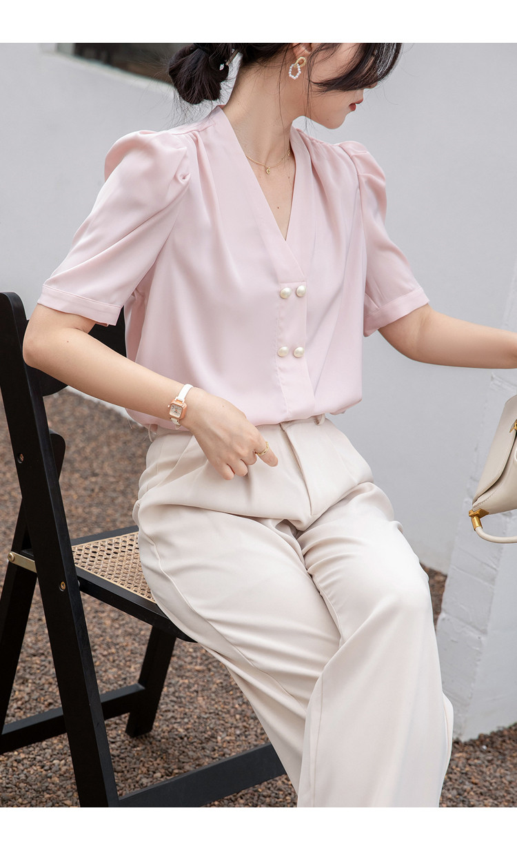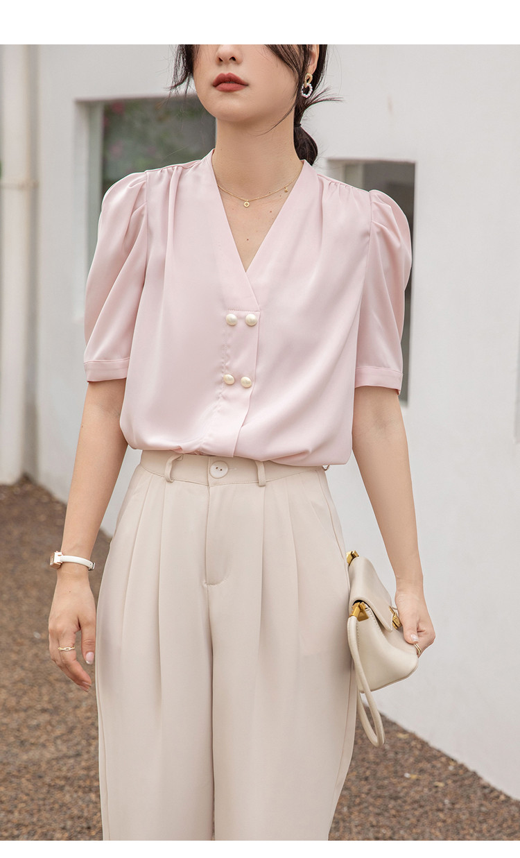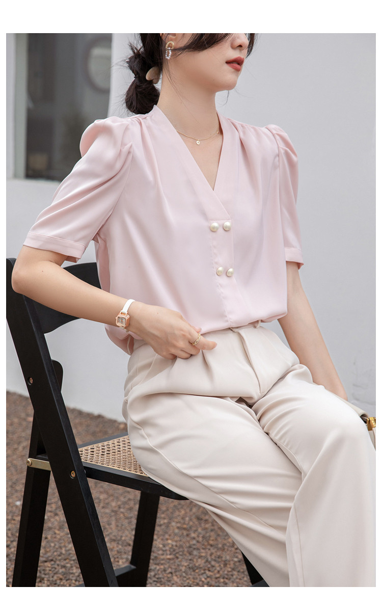 商品名 ブラウス レディース シャツ vネック ボリューム袖 プルオーバー 無地 シンプル オフィス カジュアル 通勤
