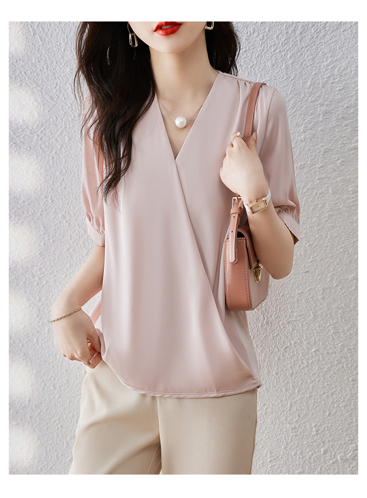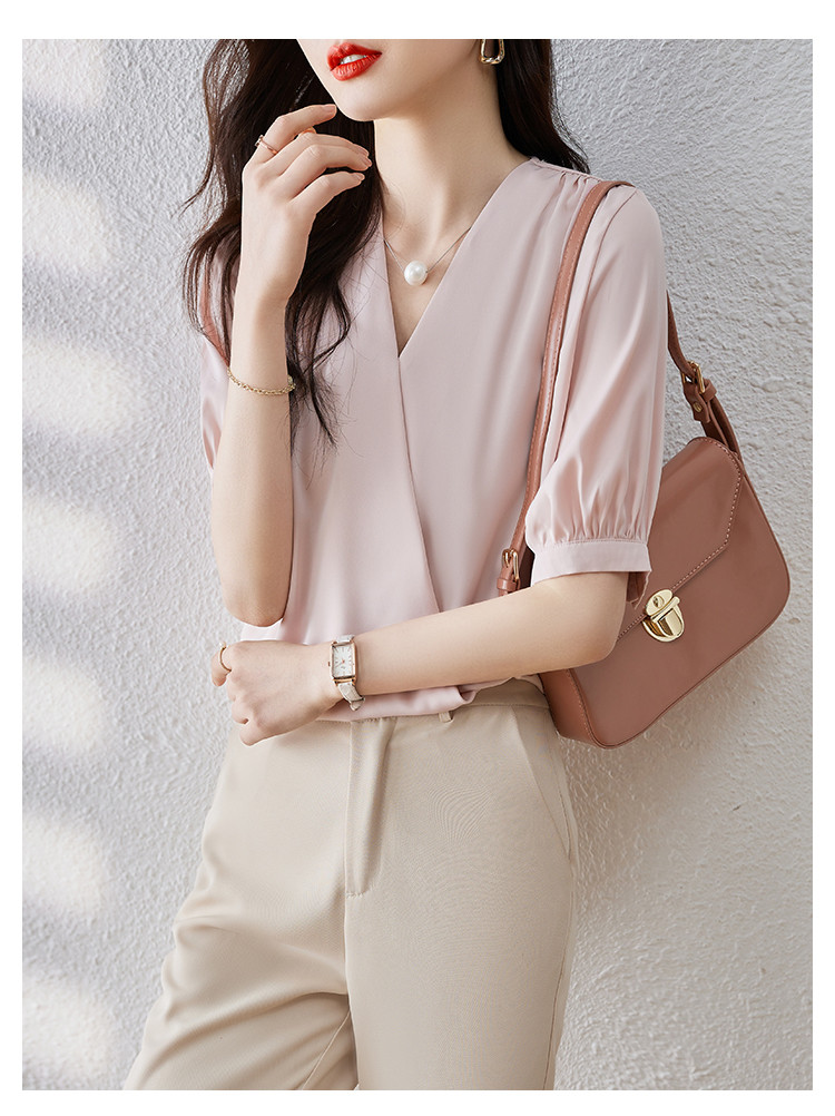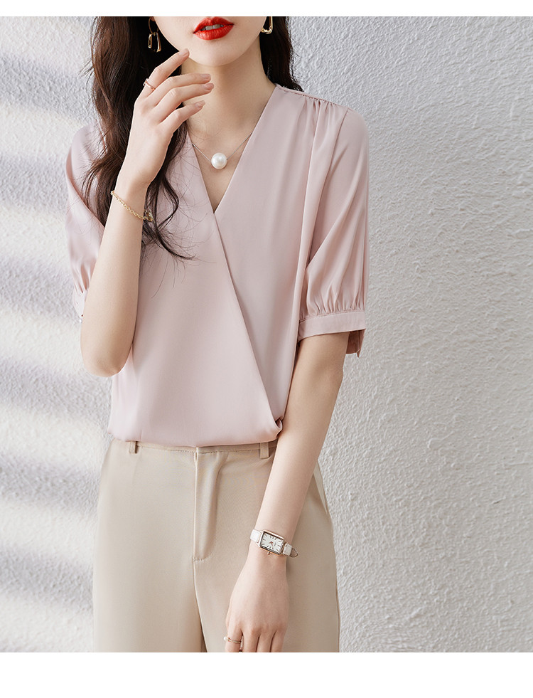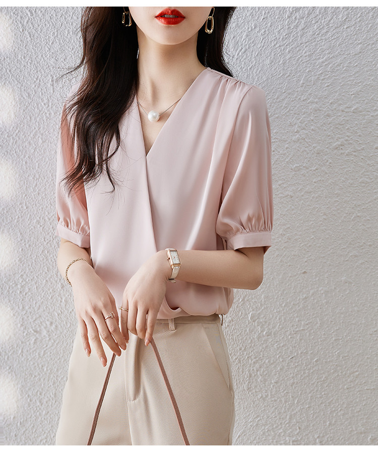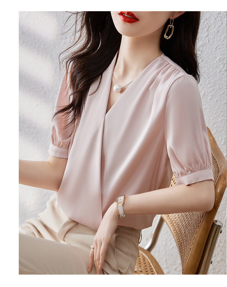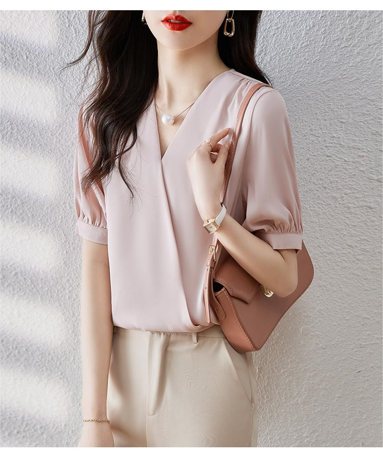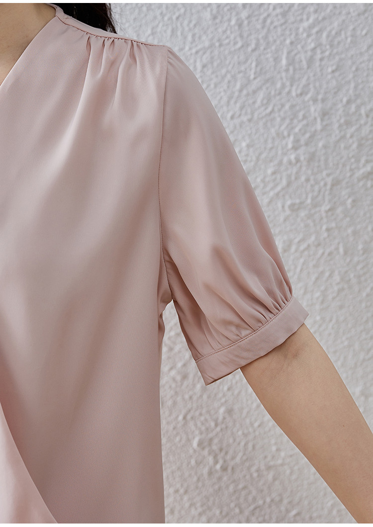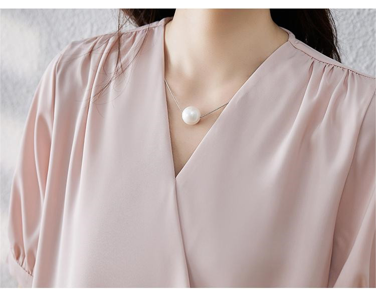 商品名 ブラウス レディース シャツ vネック プルオーバー 無地 タック とろみ袖 オフィス カジュアル 通勤 OL