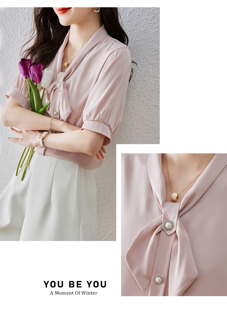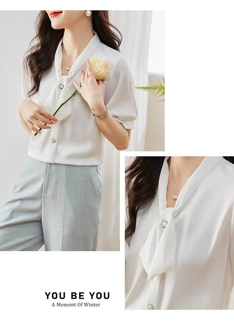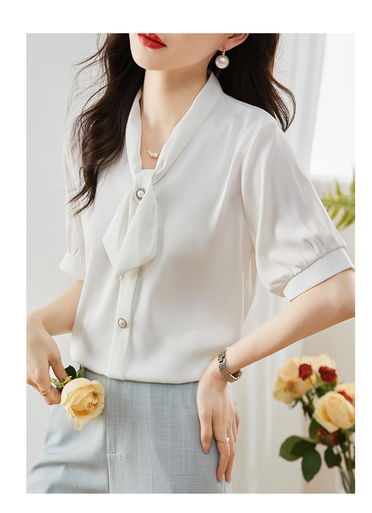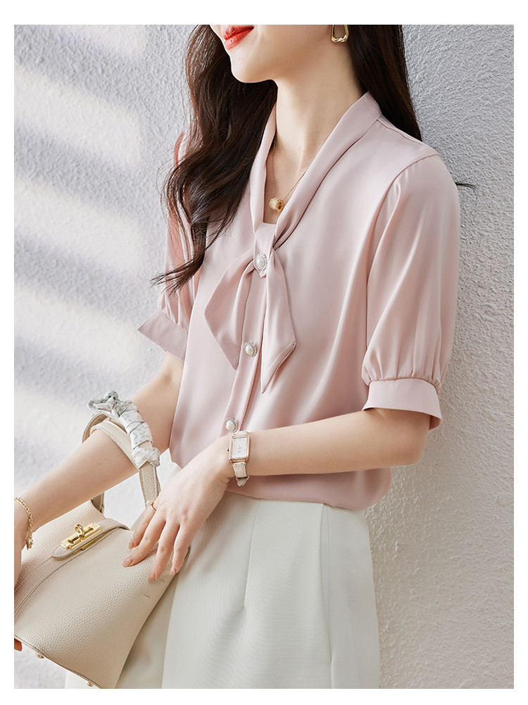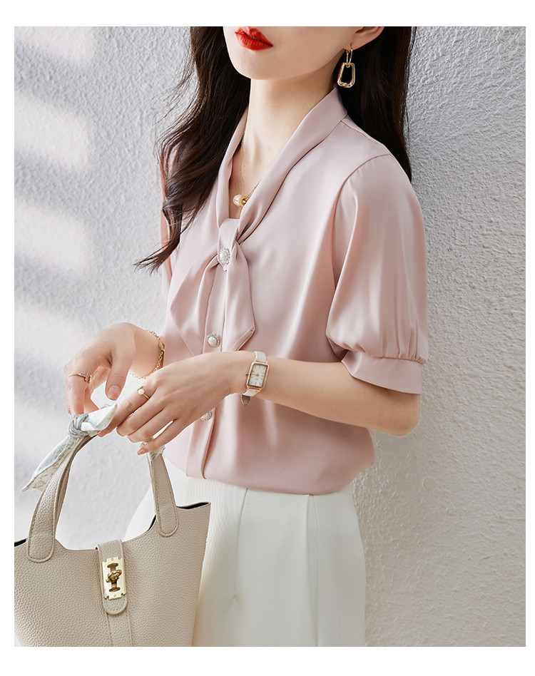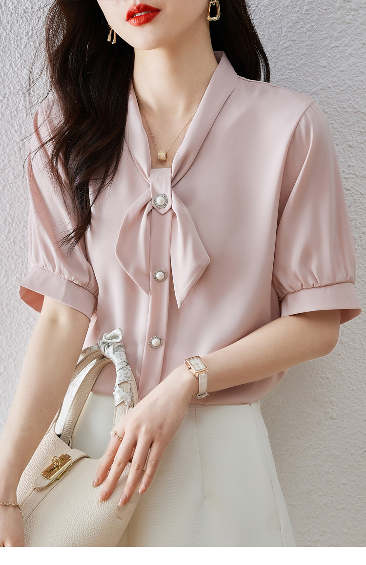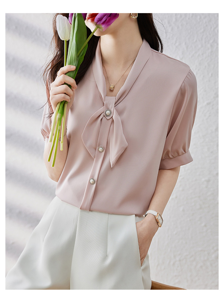 商品名 ブラウス レディース シャツ リボン vネック バンドカラー とろみ袖 無地 オフィス カジュアル 通勤 OL
