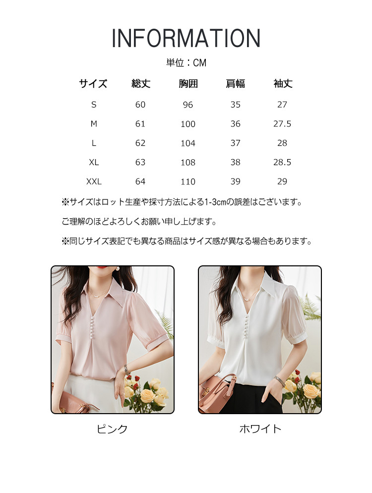 ※お取り扱い前に、商品付属タグの記載もご確認下さい。商品情報商品名 ブラウス レディース シャツ vネック パール 襟 透け感 無地 ゆったり おしゃれ オフィス カジュアル 通勤素材 ポリエステルカラー ホワイト|ピンクサイズ S|M|L|XL|XXL生産国 中国包装について 環境保護の観点から、「簡易包装」を推進しております明細書について 当店ではエコロジーと個人情報流出防止のため、ご指示の無い限り明細書を発行しておりません。