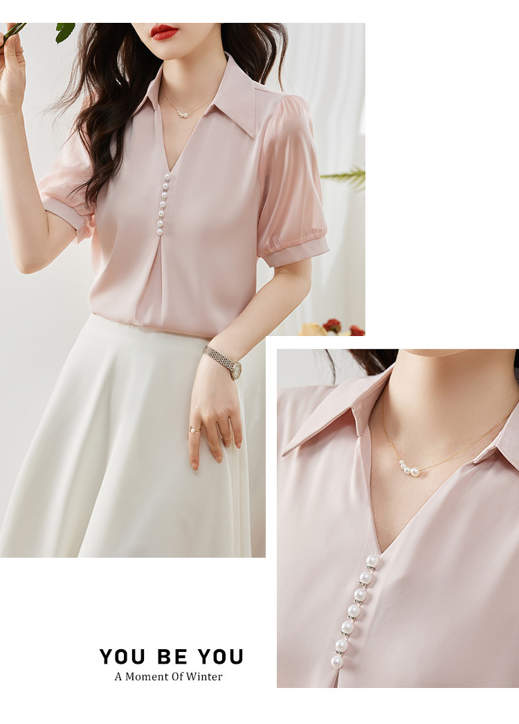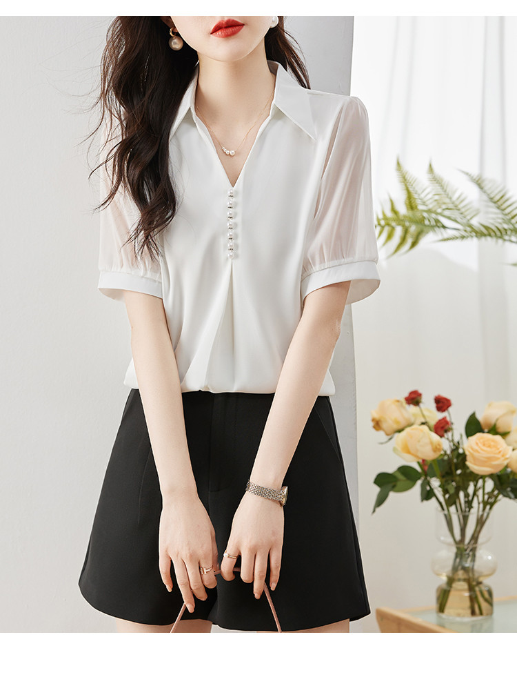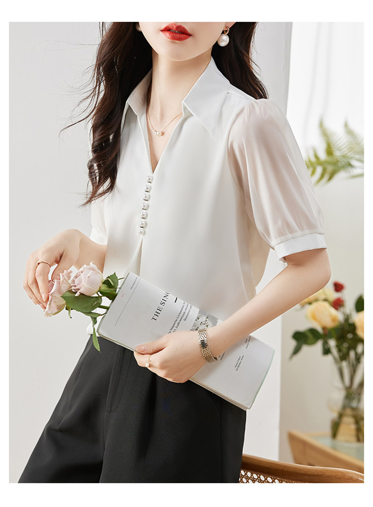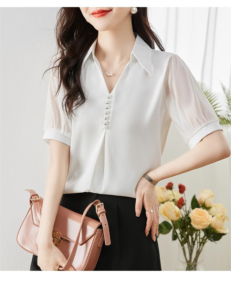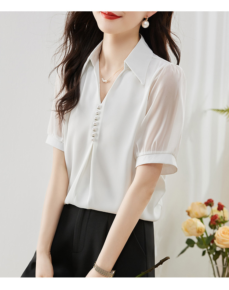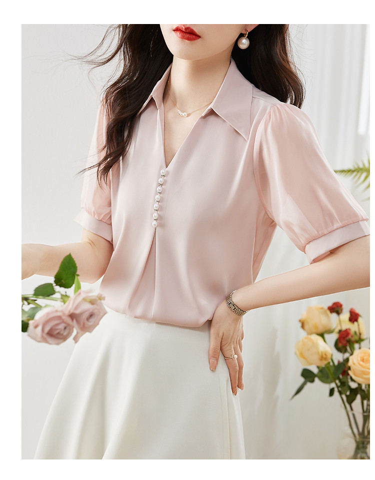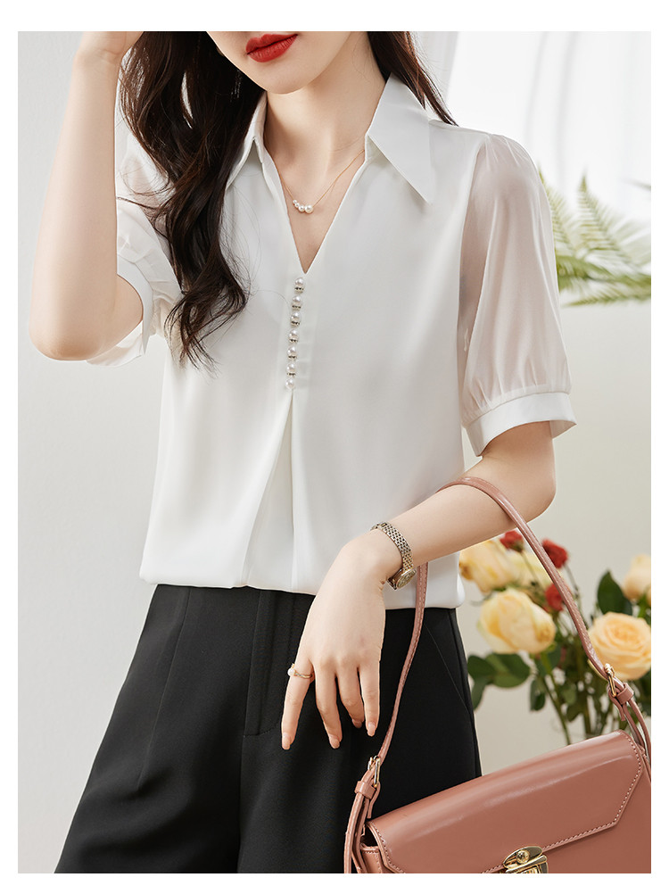 商品名 ブラウス レディース シャツ vネック パール 襟 透け感 無地 ゆったり おしゃれ オフィス カジュアル 通勤
