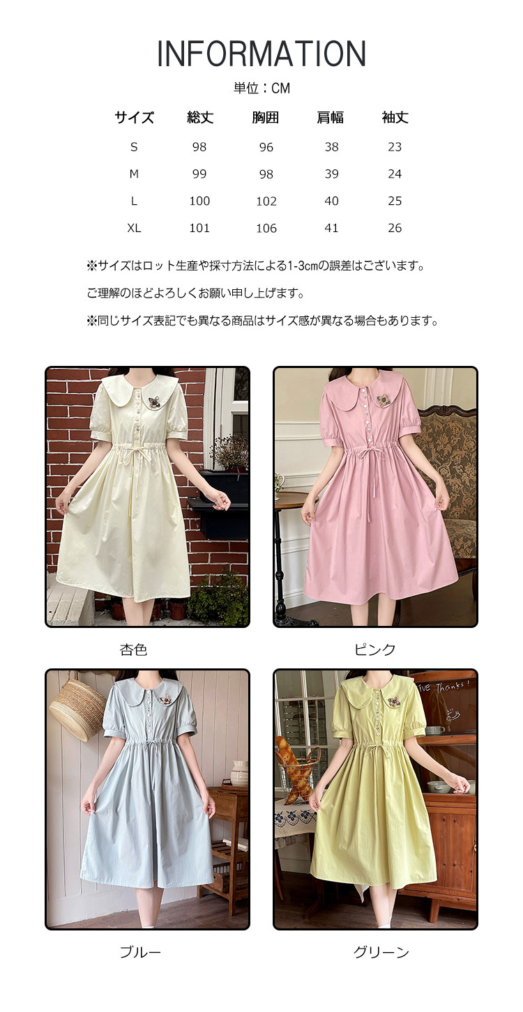 ※お取り扱い前に、商品付属タグの記載もご確認下さい。商品情報商品名 ワンピース レディース ワンピ 丸襟 ウエストリボン シャツワンピ Aラインスカート 膝下 カジュアル 夏物素材 ポリエステルカラー 杏色|ピンク|ブルー|グリーンサイズ S|M|L|XL生産国 中国包装について 環境保護の観点から、「簡易包装」を推進しております明細書について 当店ではエコロジーと個人情報流出防止のため、ご指示の無い限り明細書を発行しておりません。