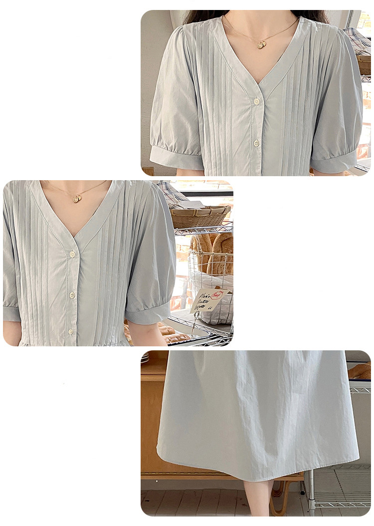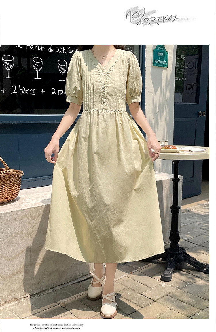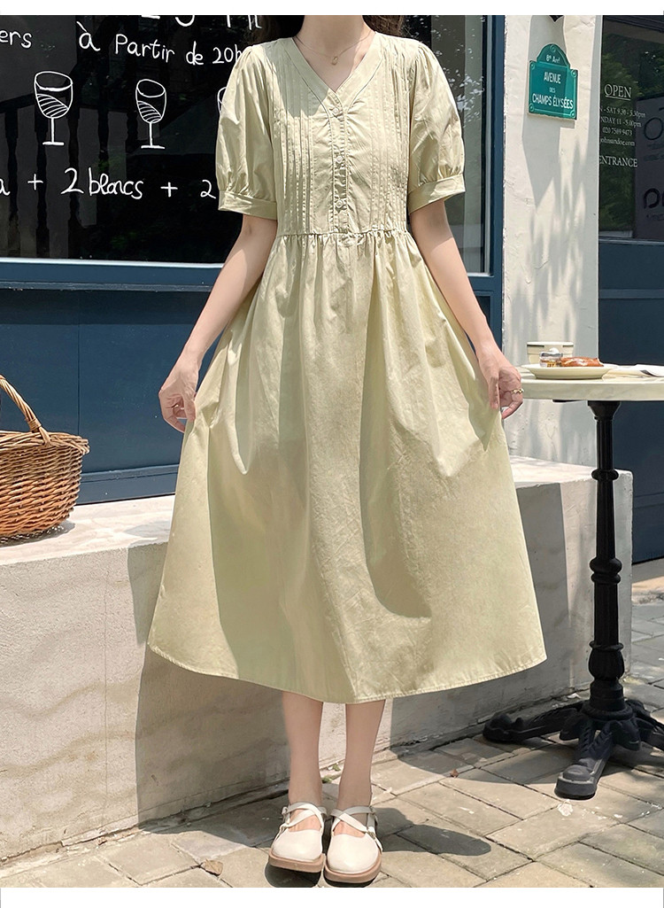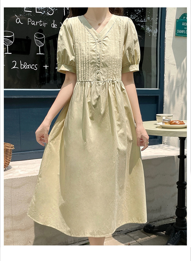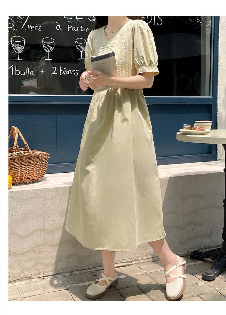 商品名 ワンピ レディース ワンピース ピンタック vネック 半袖 ぽわん袖 膝下 ロングワンピース Aラインスカート