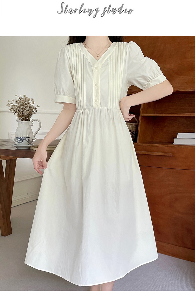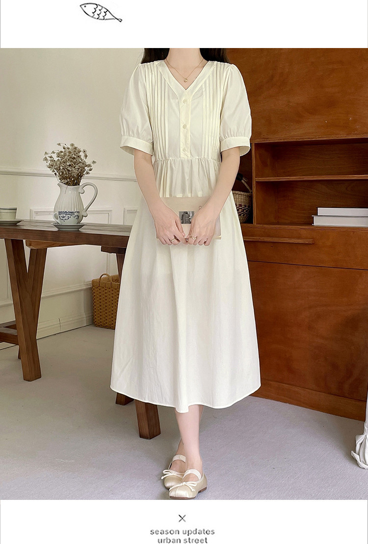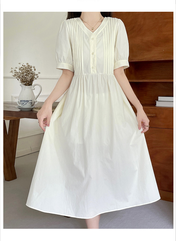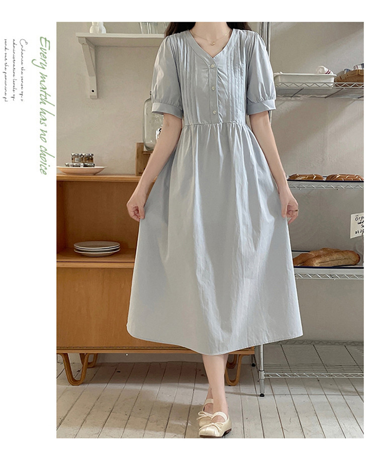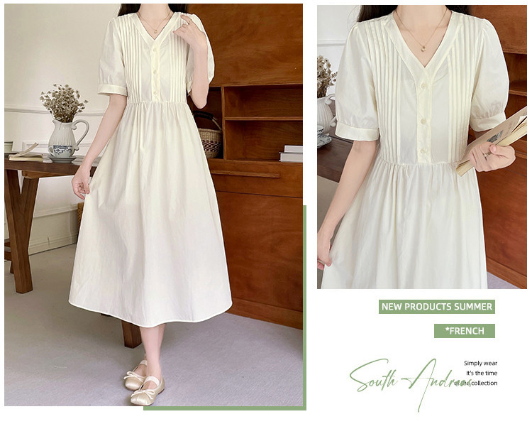 商品名 ワンピ レディース ワンピース ピンタック vネック 半袖 ぽわん袖 膝下 ロングワンピース Aラインスカート