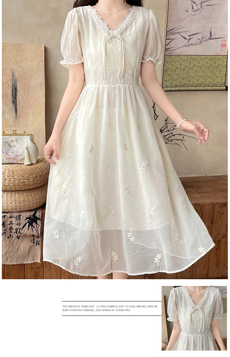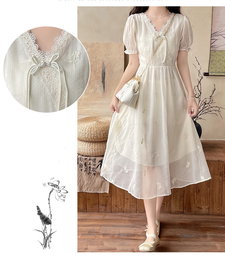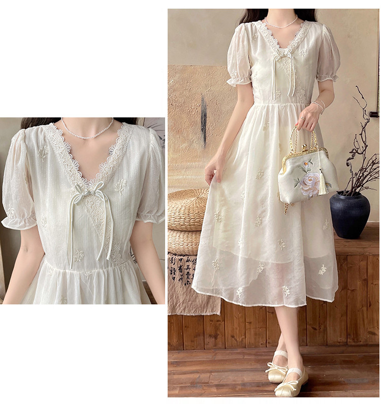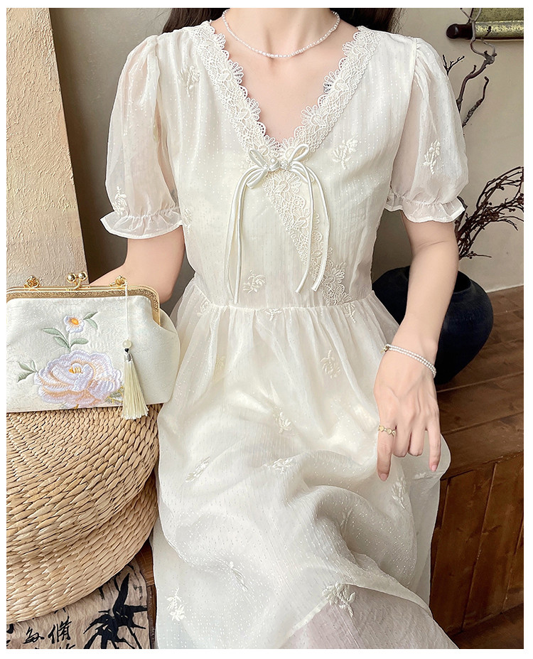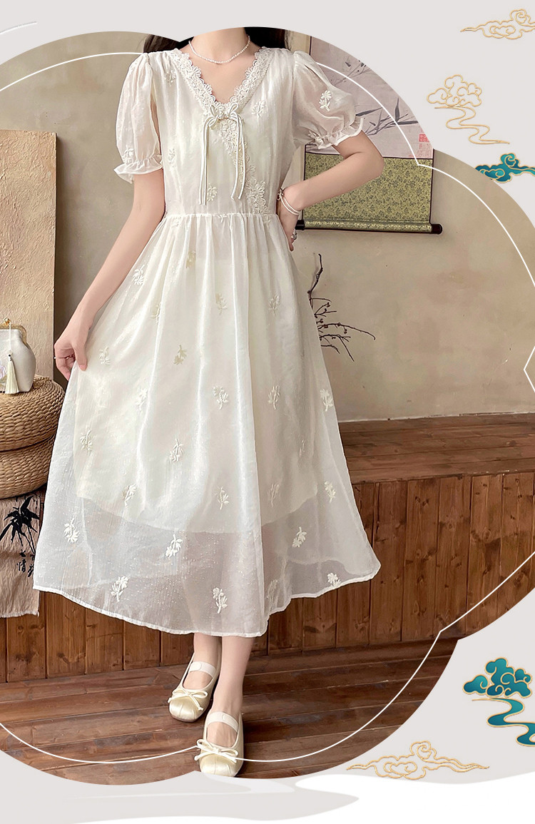 商品名 ワンピ レディース ワンピース チャイナボタン 中華風 vネック 半袖 膝下 キャンディースリーブ カジュアル