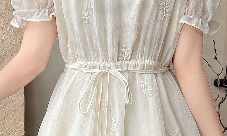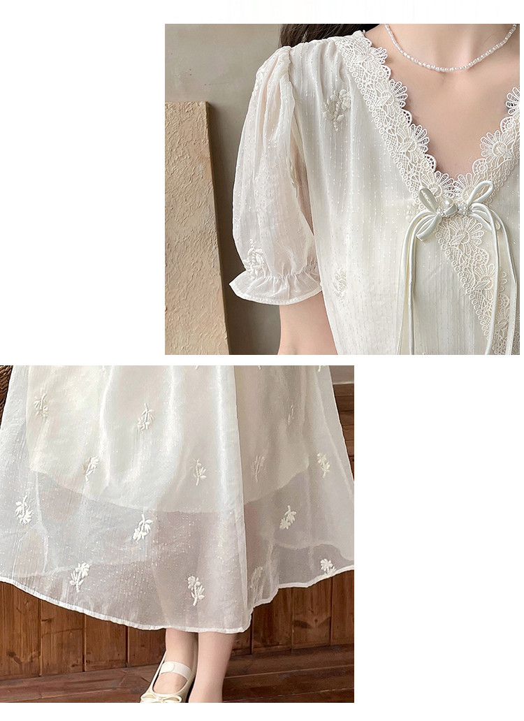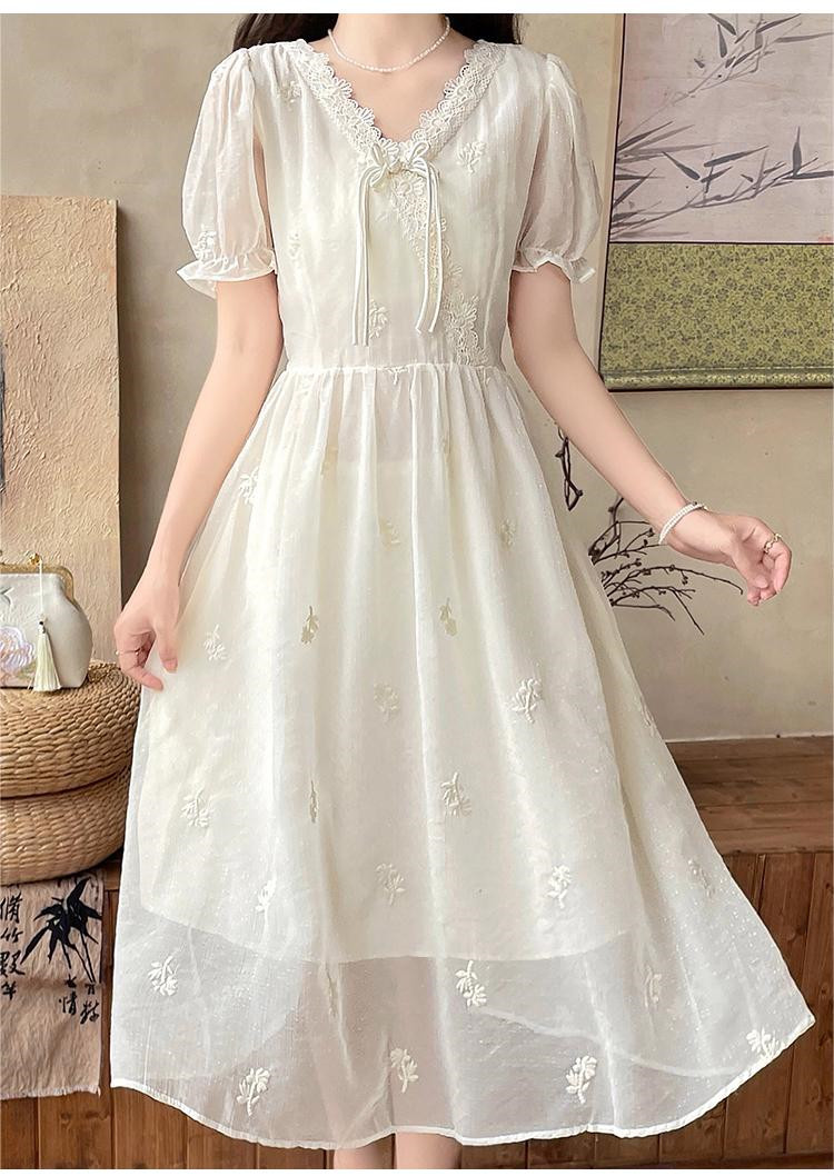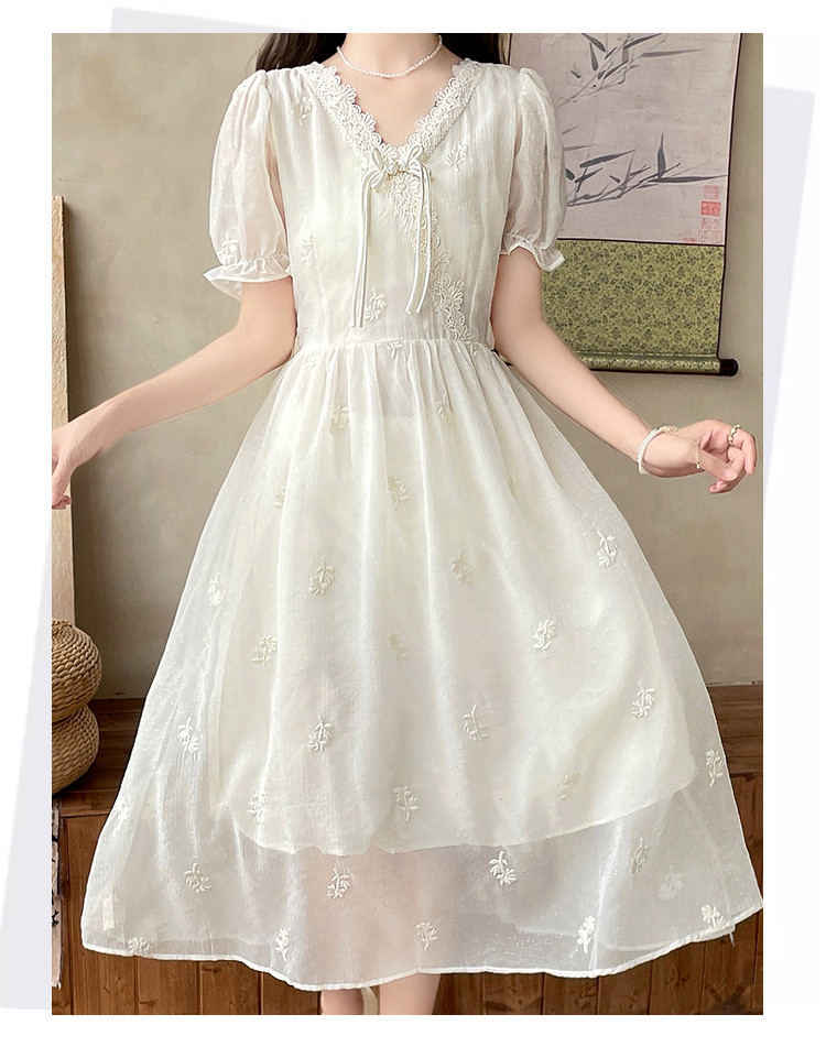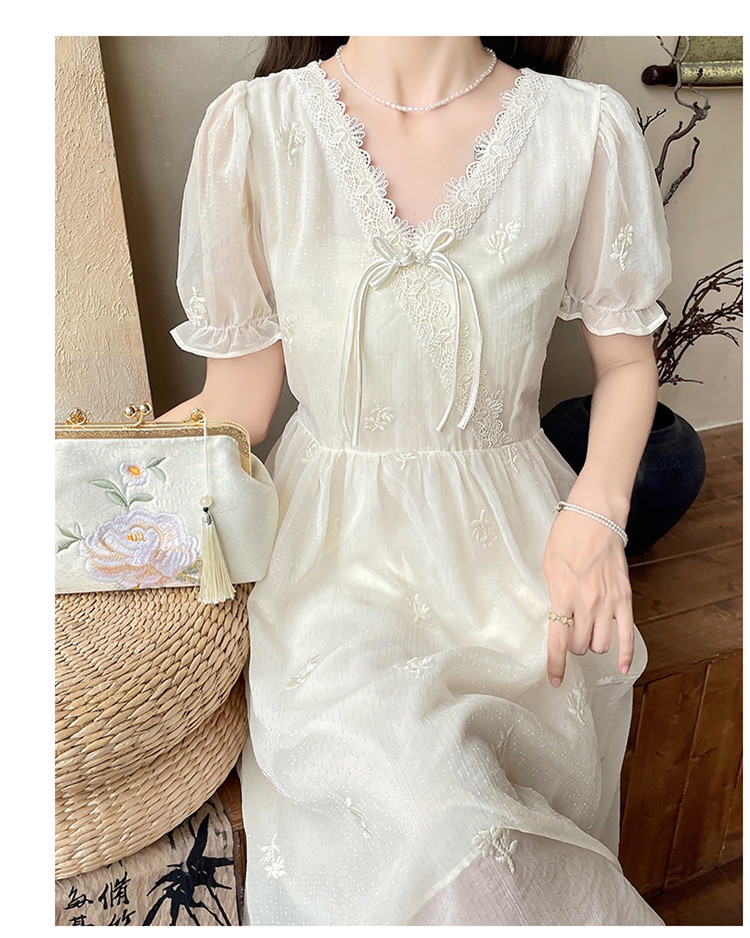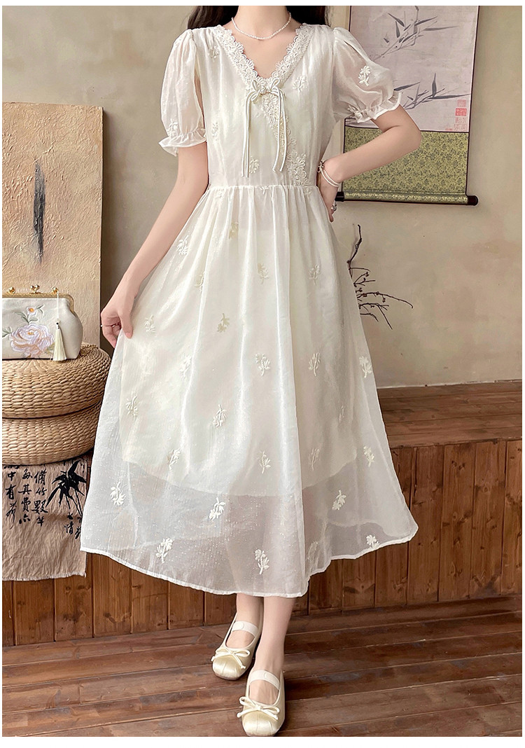 商品名 ワンピ レディース ワンピース チャイナボタン 中華風 vネック 半袖 膝下 キャンディースリーブ カジュアル