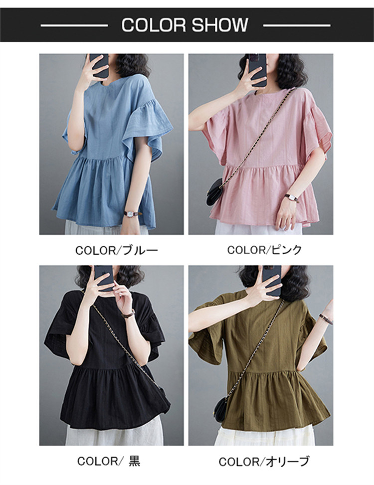 ※お取り扱い前に、商品付属タグの記載もご確認下さい。商品情報商品名 フレアスリーブブラウス レディース ブラウス 半袖 フレア袖 クルーネック 無地 トップス 夏 プルオーバー ギャザー フリル袖 無地 仕事 シンプル カジュアル かわいい フェミニン 大人 夏物 20代 30代 40代 おしゃれ 普段着 母の日 プレゼント 夏服 通勤通学素材 コットンカラー ブルー|ピンク|黒|オリーブサイズ M|L|XL生産国 中国包装について 環境保護の観点から、「簡易包装」を推進しております明細書について 当店ではエコロジーと個人情報流出防止のため、ご指示の無い限り明細書を発行しておりません。