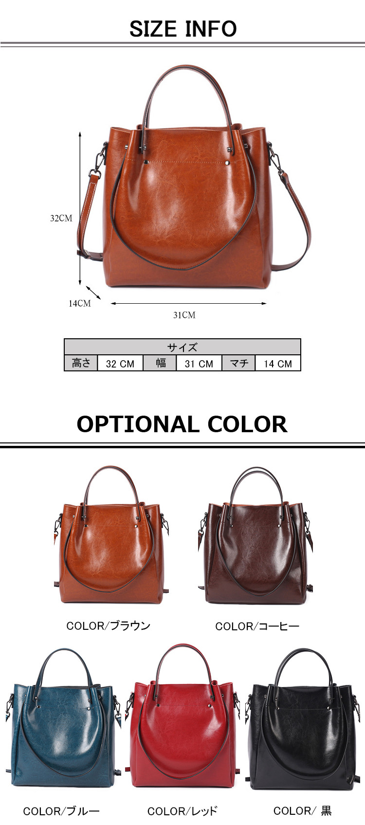 ※お取り扱い前に、商品付属タグの記載もご確認下さい。商品情報商品名 本革 バッグ 2way ショルダーバッグ トートバッグ レディース 通勤バッグ 大容量 上品 ビジネス おしゃれ素材 本革カラー ブラウン|コーヒー|ブルー|ブラック|レッドサイズ F生産国 中国包装について 環境保護の観点から、「簡易包装」を推進しております明細書について 当店ではエコロジーと個人情報流出防止のため、ご指示の無い限り明細書を発行しておりません。