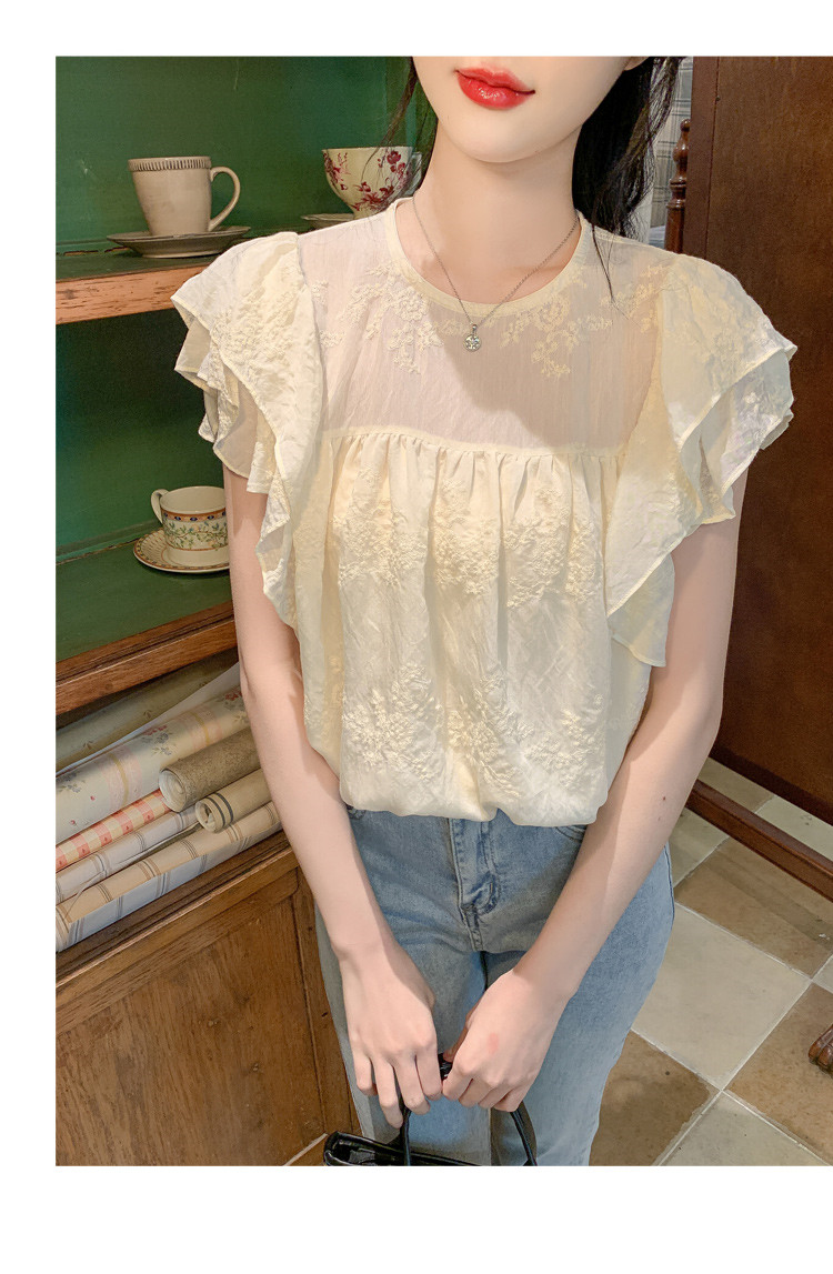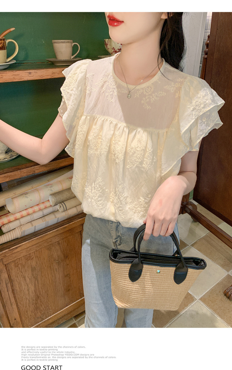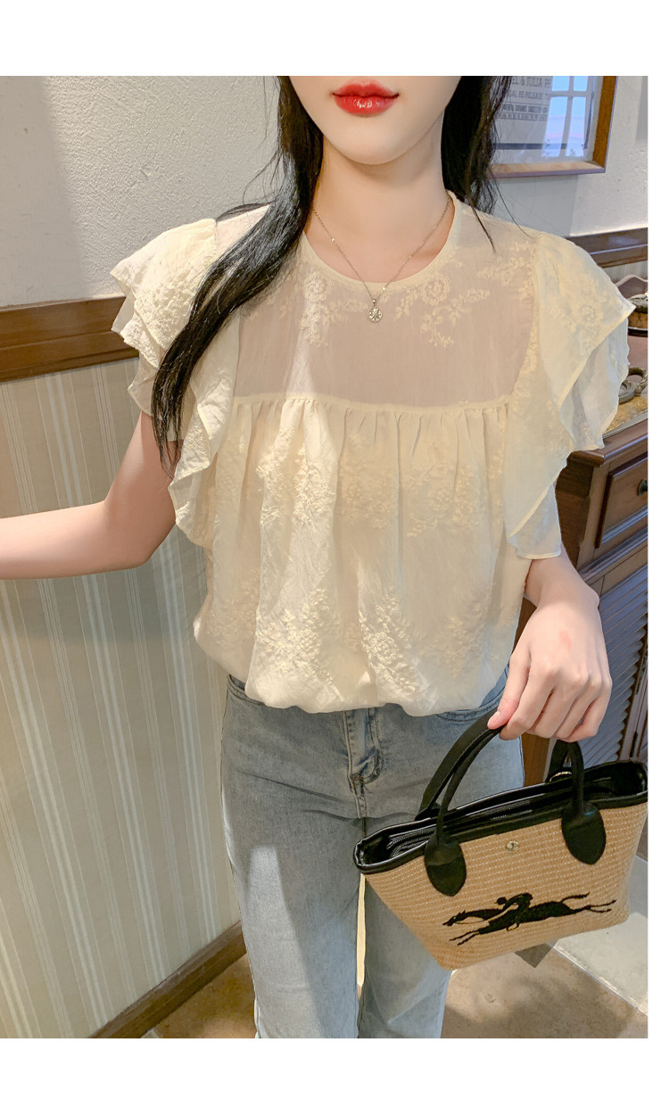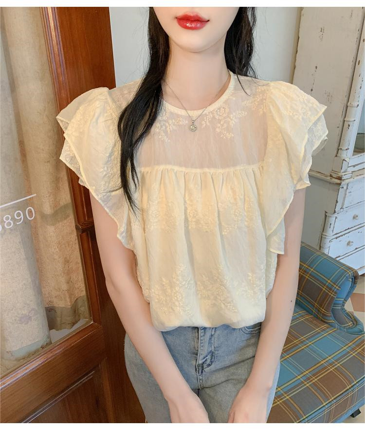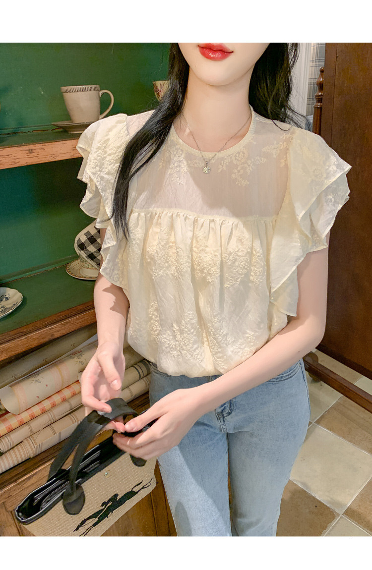 商品名 シャツ レディース ブラウス フレンチスリーブ ジャカード ラウンドカラー ゆったり フェミニン おしゃれ