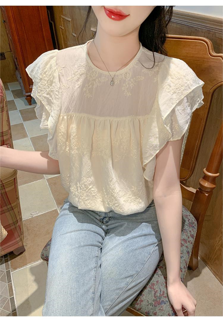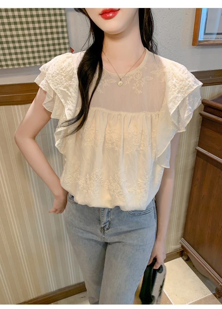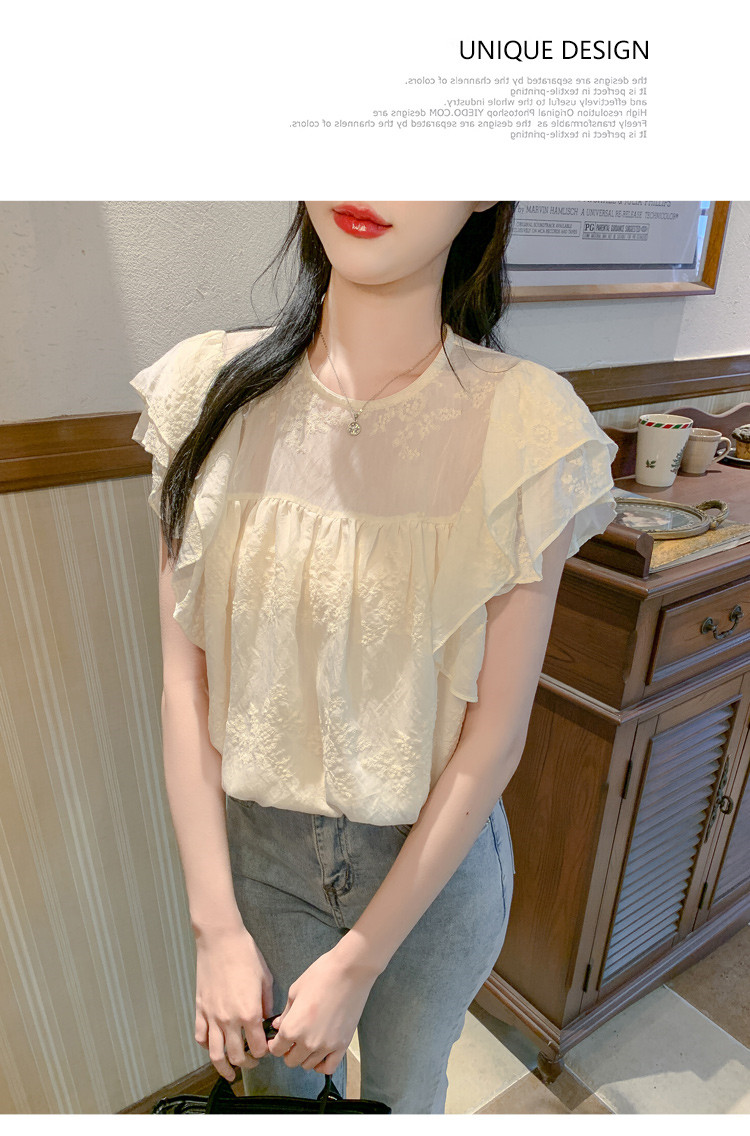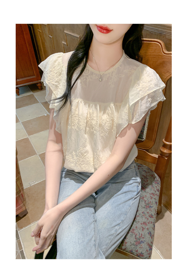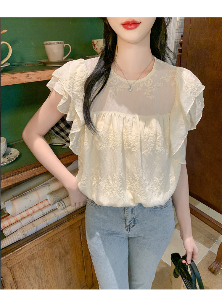 商品名 シャツ レディース ブラウス フレンチスリーブ ジャカード ラウンドカラー ゆったり フェミニン おしゃれ