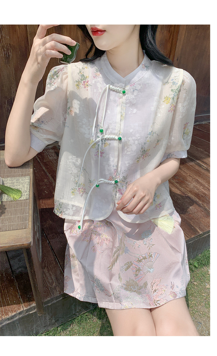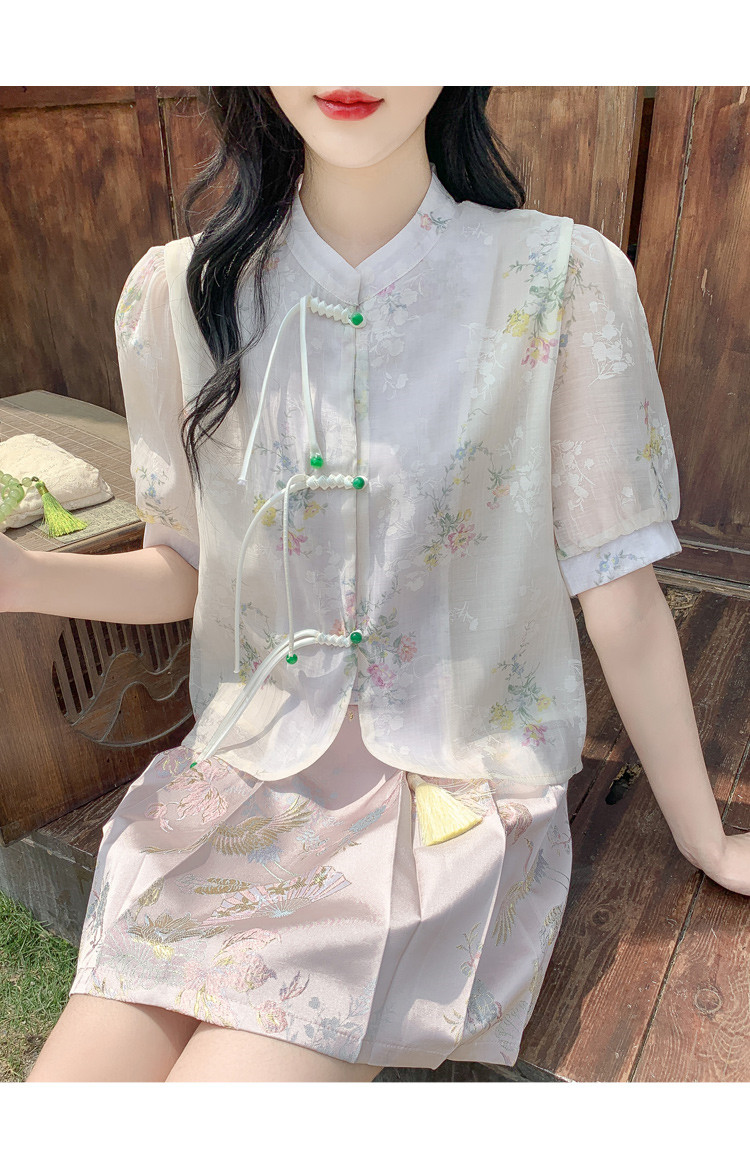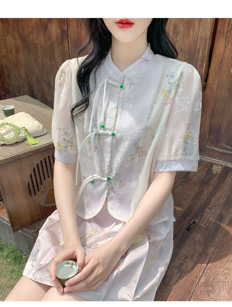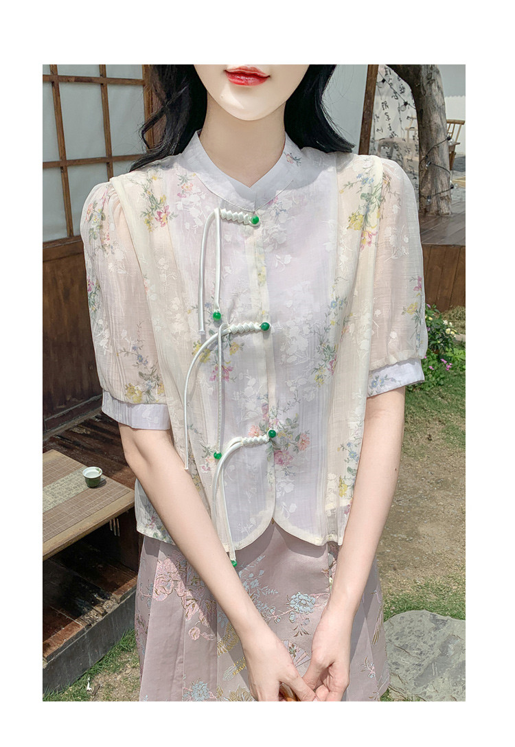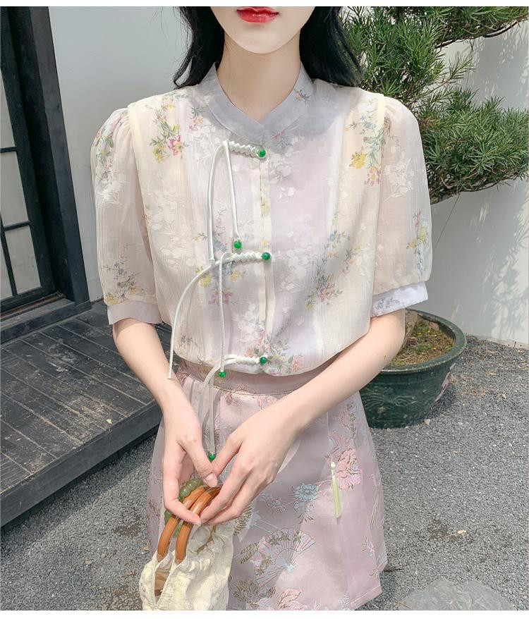 商品名 シャツ レディース チャイナ ブラウス 花柄 バンドカラー とろみ袖 半袖 透け感 可愛い ゆったり 中華風 夏