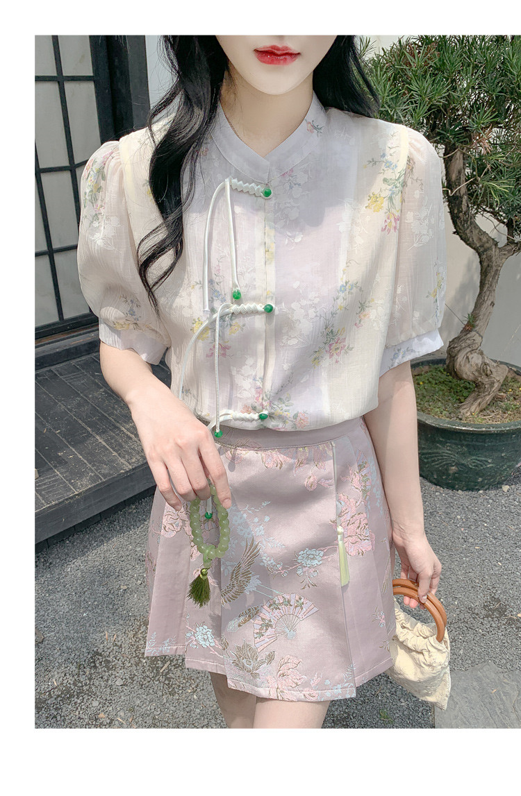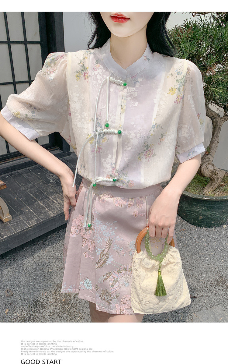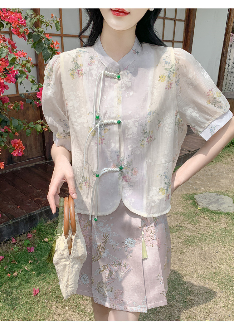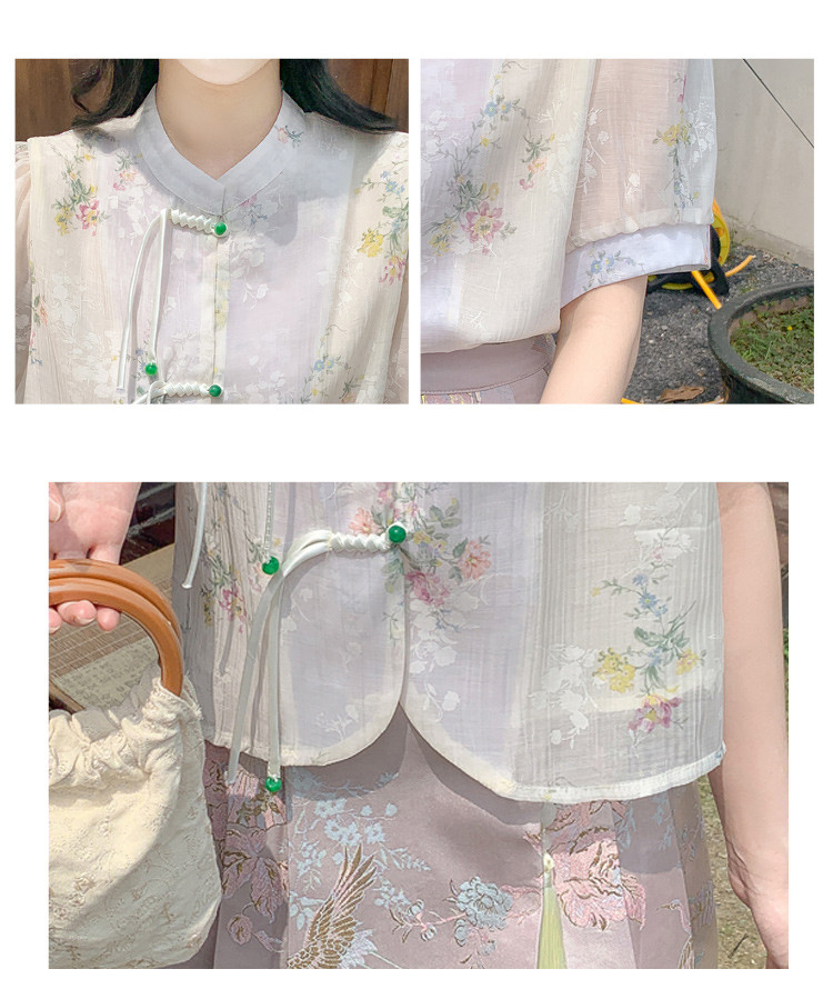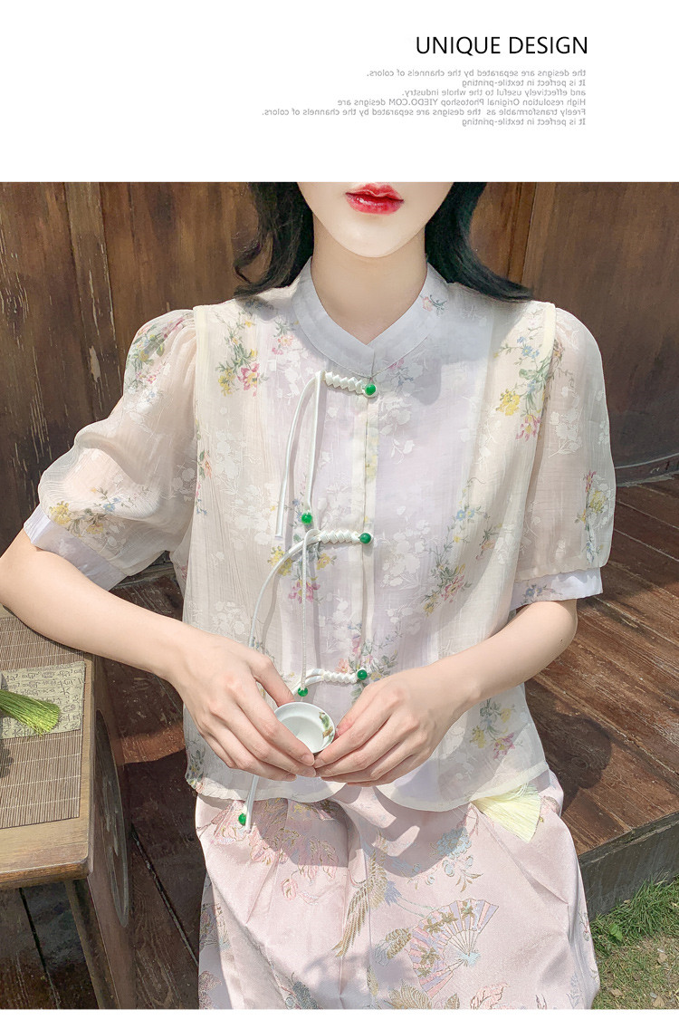 商品名 シャツ レディース チャイナ ブラウス 花柄 バンドカラー とろみ袖 半袖 透け感 可愛い ゆったり 中華風 夏