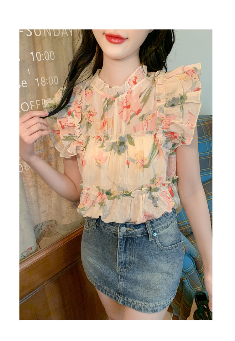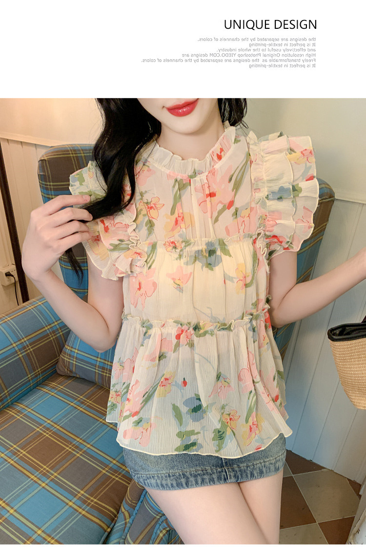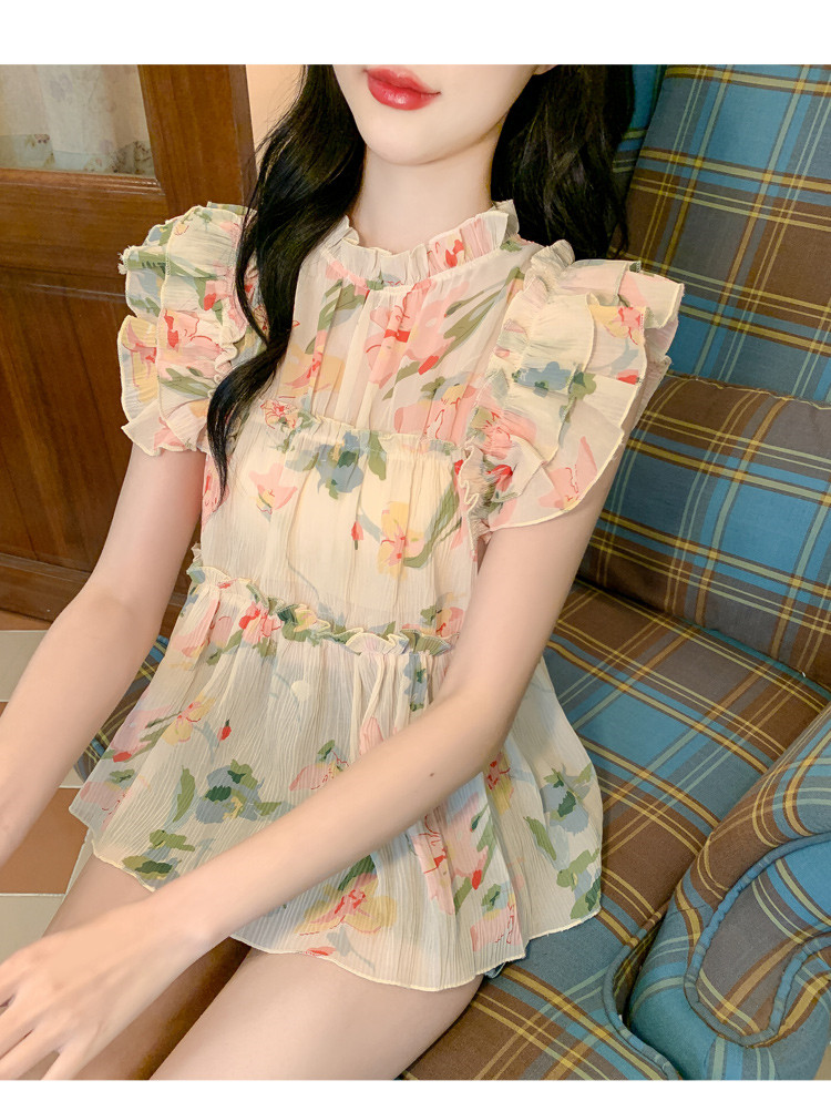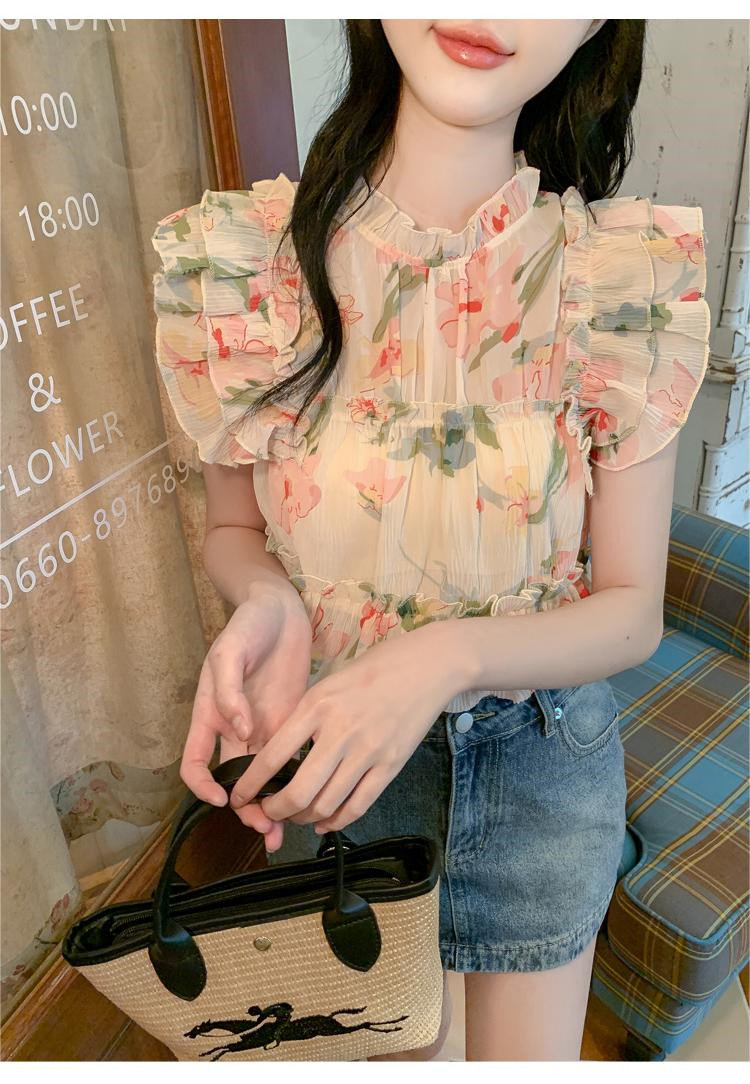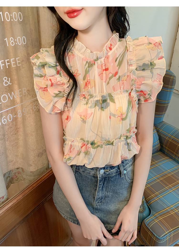商品名 ブラウス レディース シフォンシャツ フリル襟 フレンチスリーブ 花柄 総柄 ゆったり フェミニン おしゃれ
