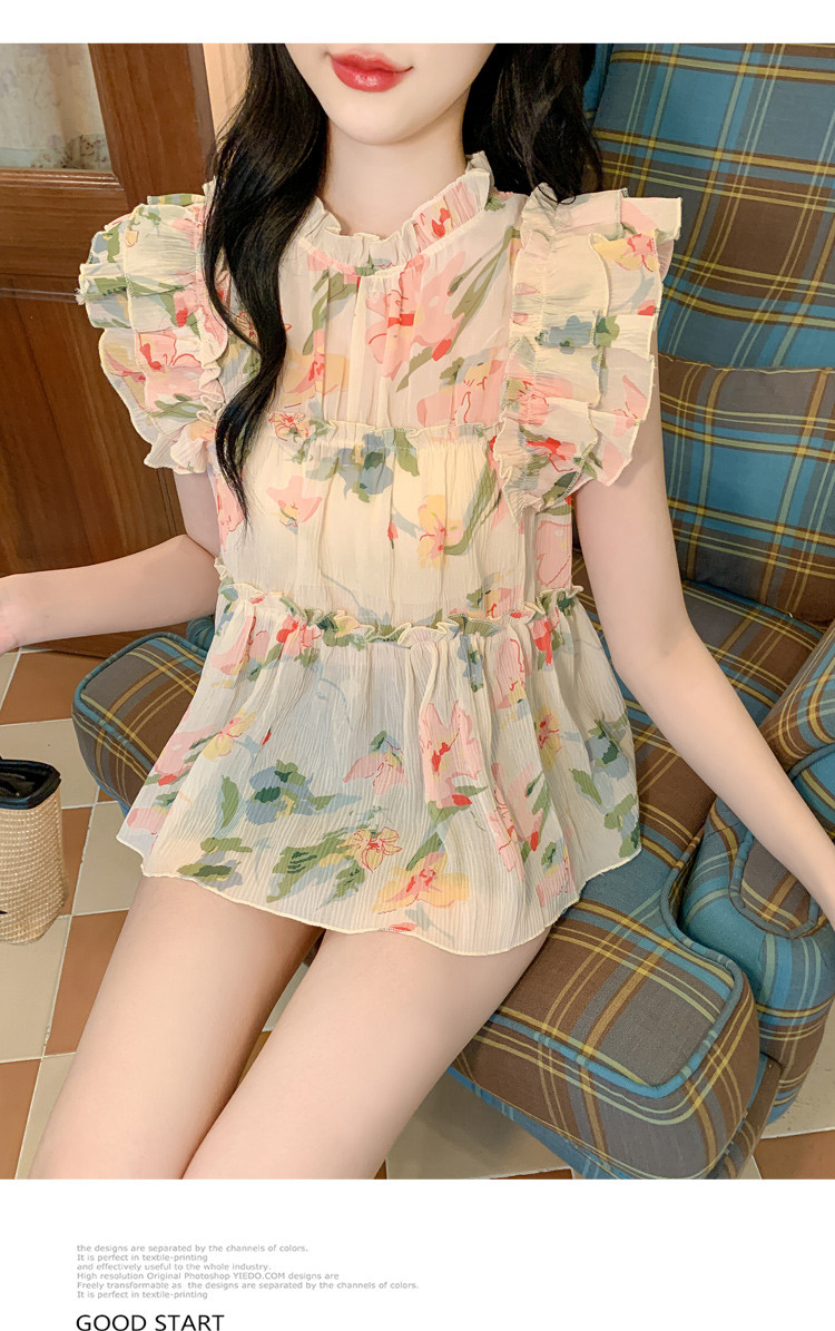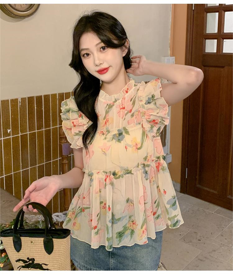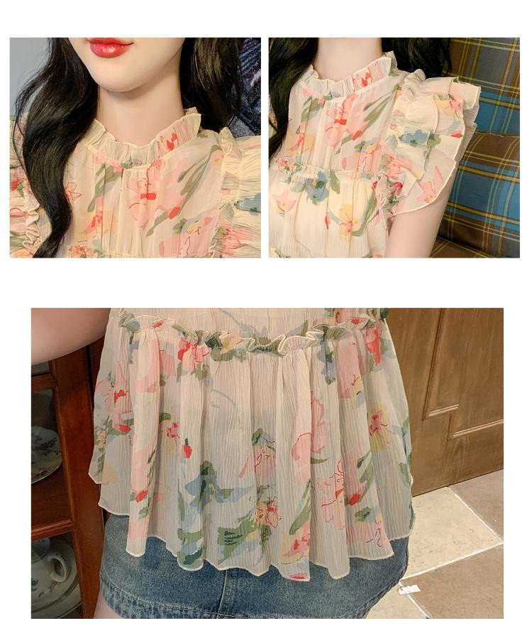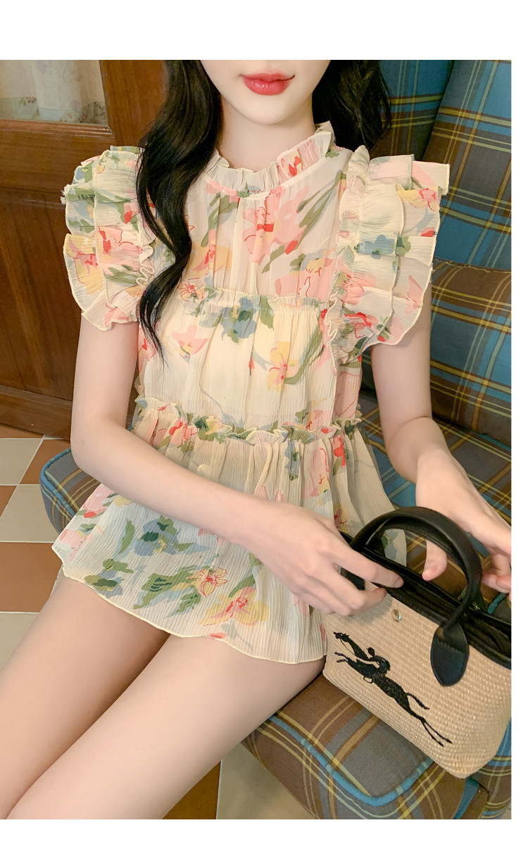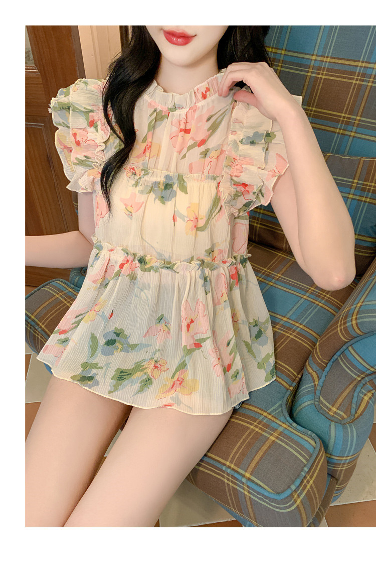 商品名 ブラウス レディース シフォンシャツ フリル襟 フレンチスリーブ 花柄 総柄 ゆったり フェミニン おしゃれ