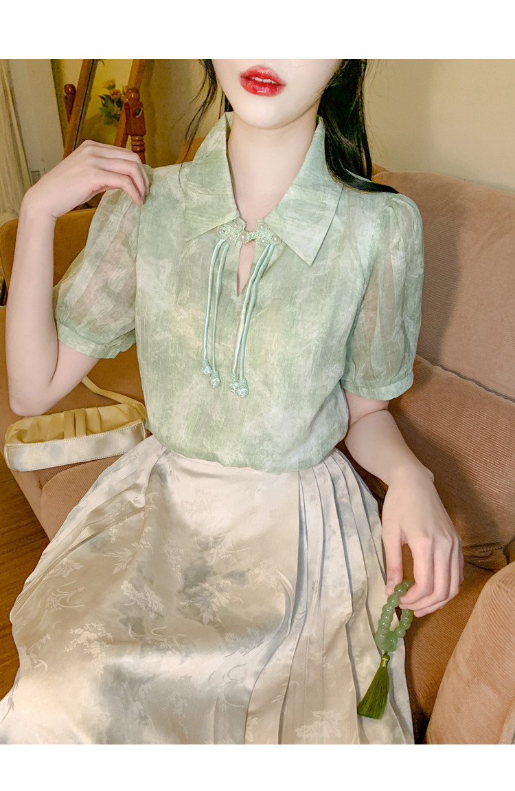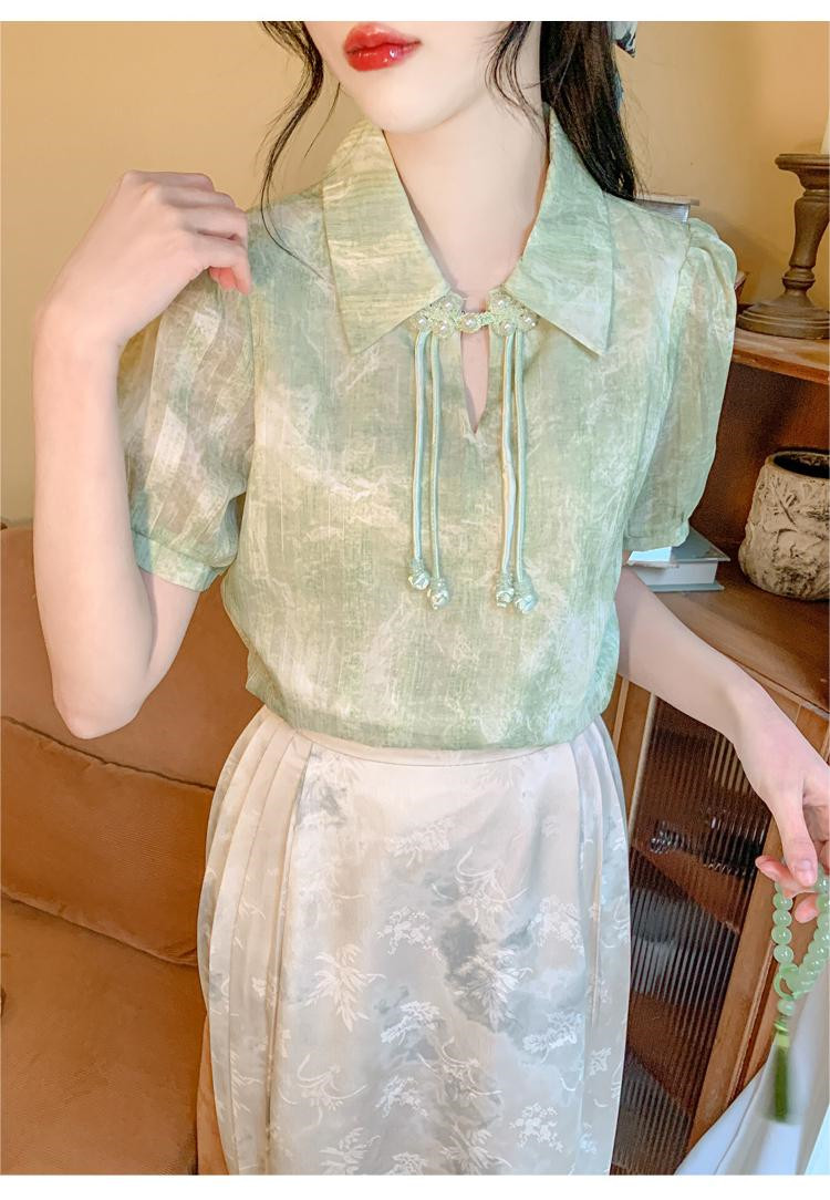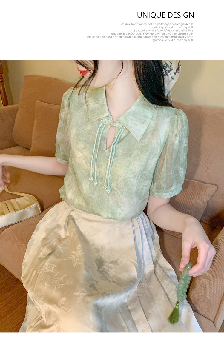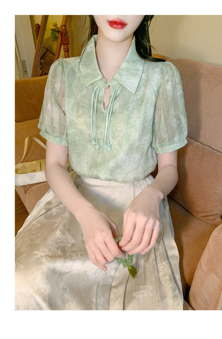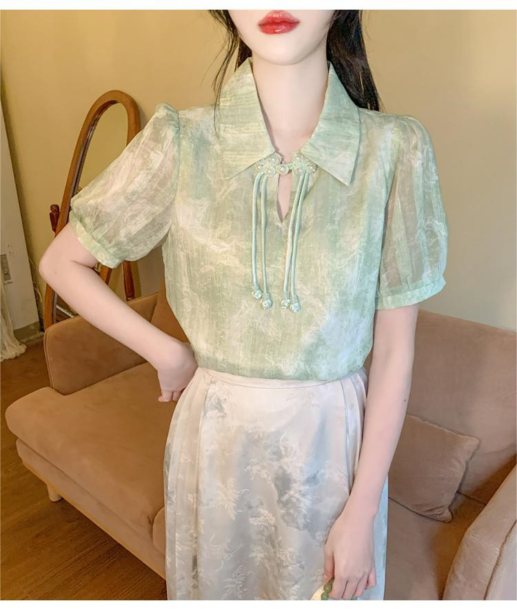 商品名 シャツ レディース チャイナ ブラウス 襟 とろみ袖 プルオーバー 半袖 ゆったり フェミニン 可愛い 中華風