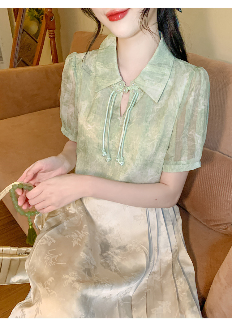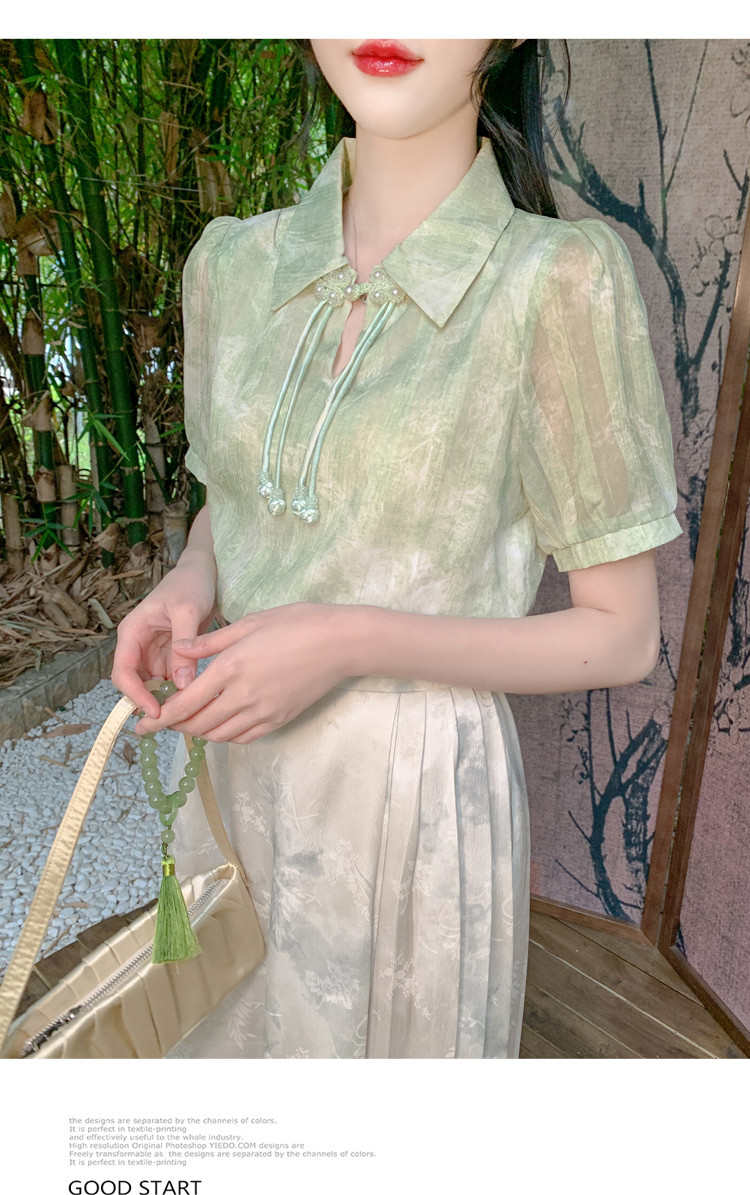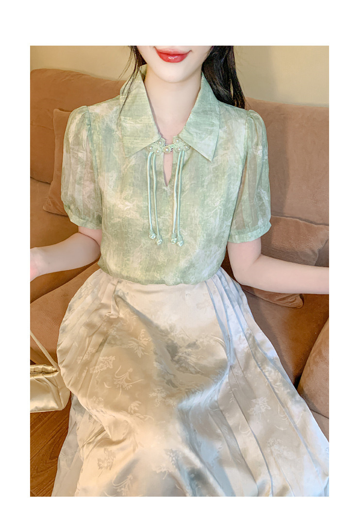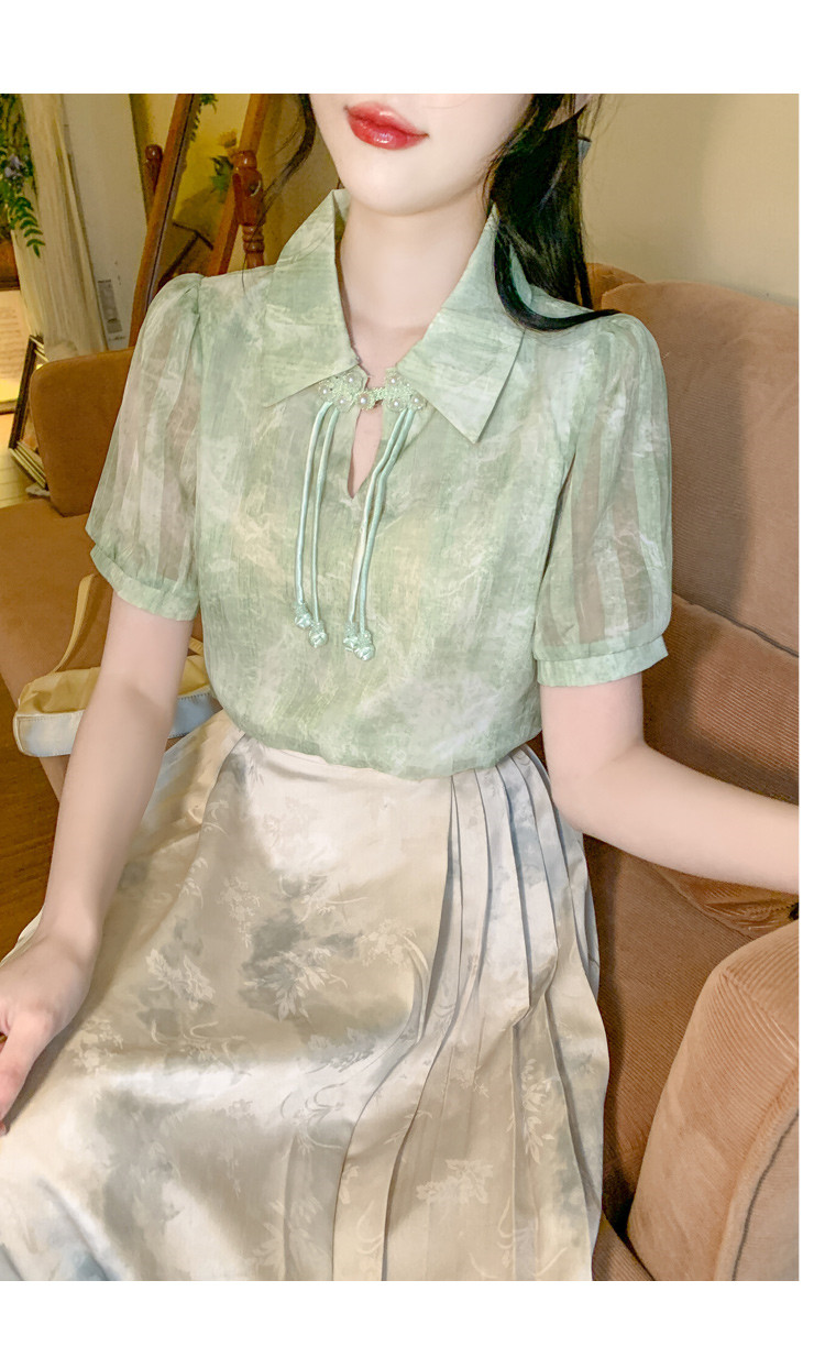 商品名 シャツ レディース チャイナ ブラウス 襟 とろみ袖 プルオーバー 半袖 ゆったり フェミニン 可愛い 中華風
