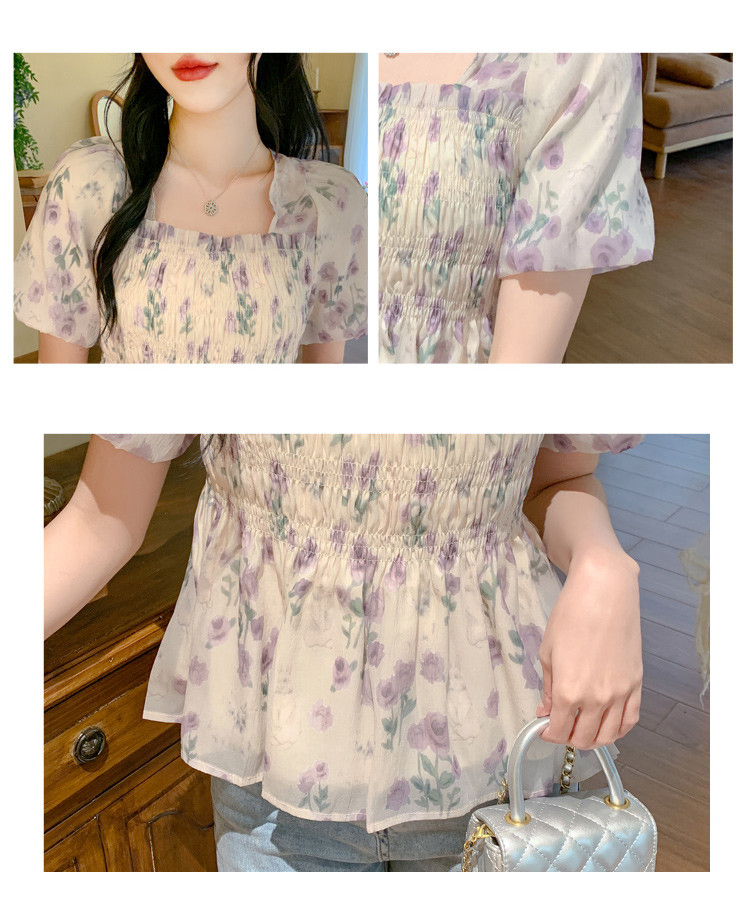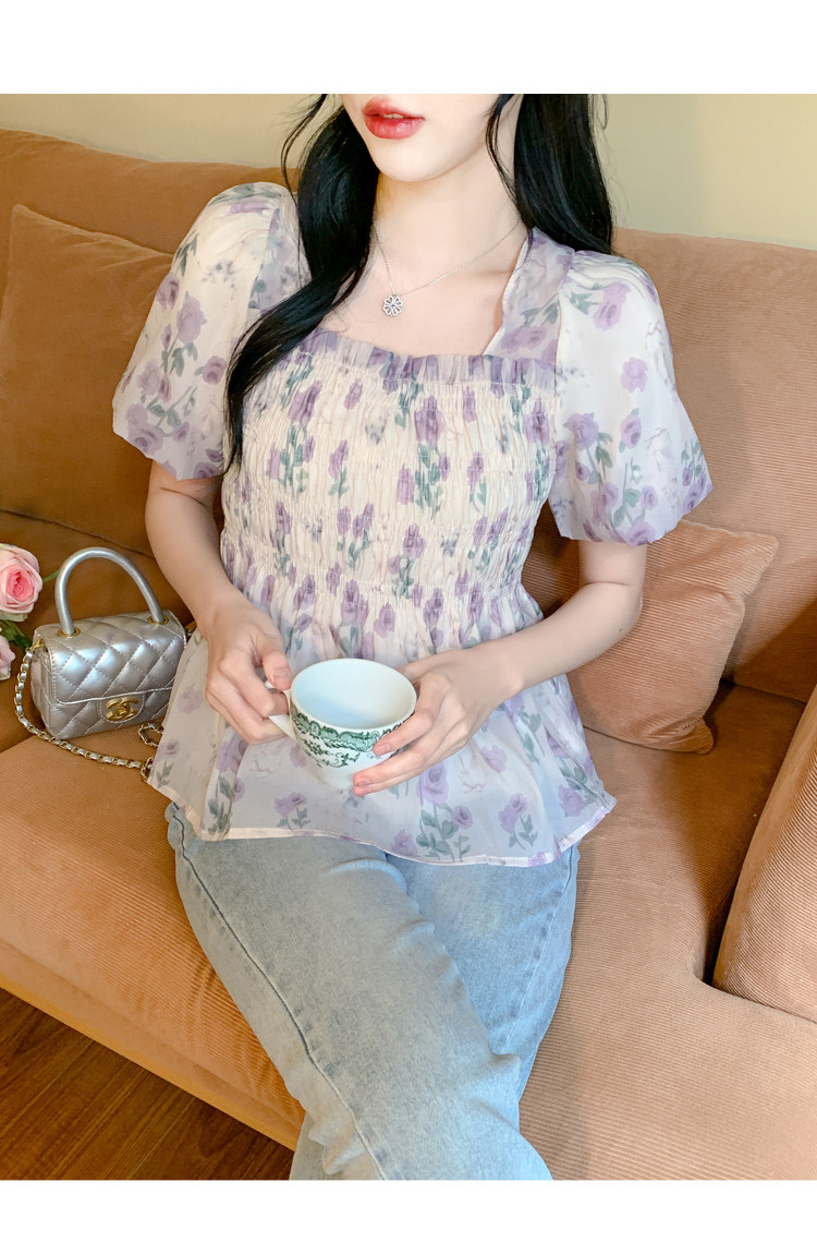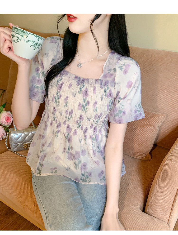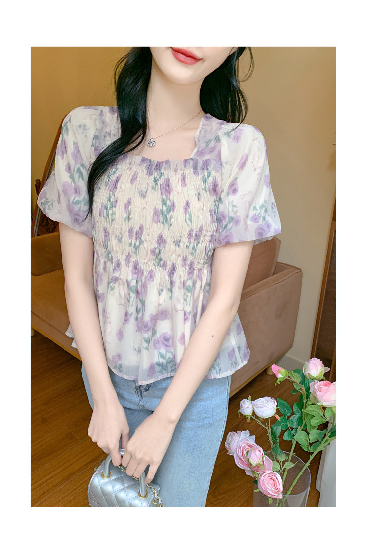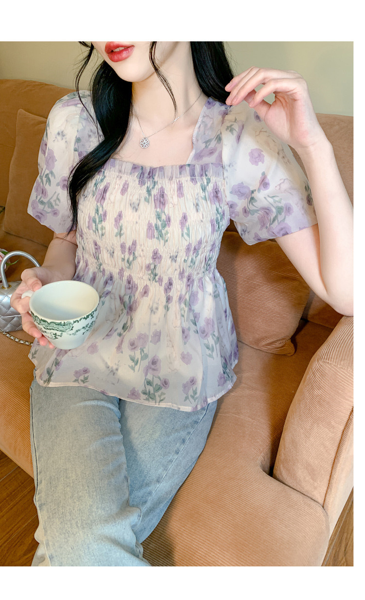 商品名 ブラウス レディース スクエアネック シフォンシャツ 花柄 総柄 ボリューム袖 半袖 プルオーバー かわいい