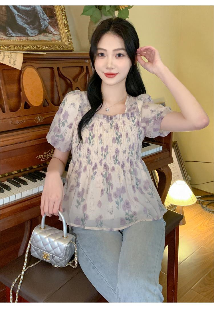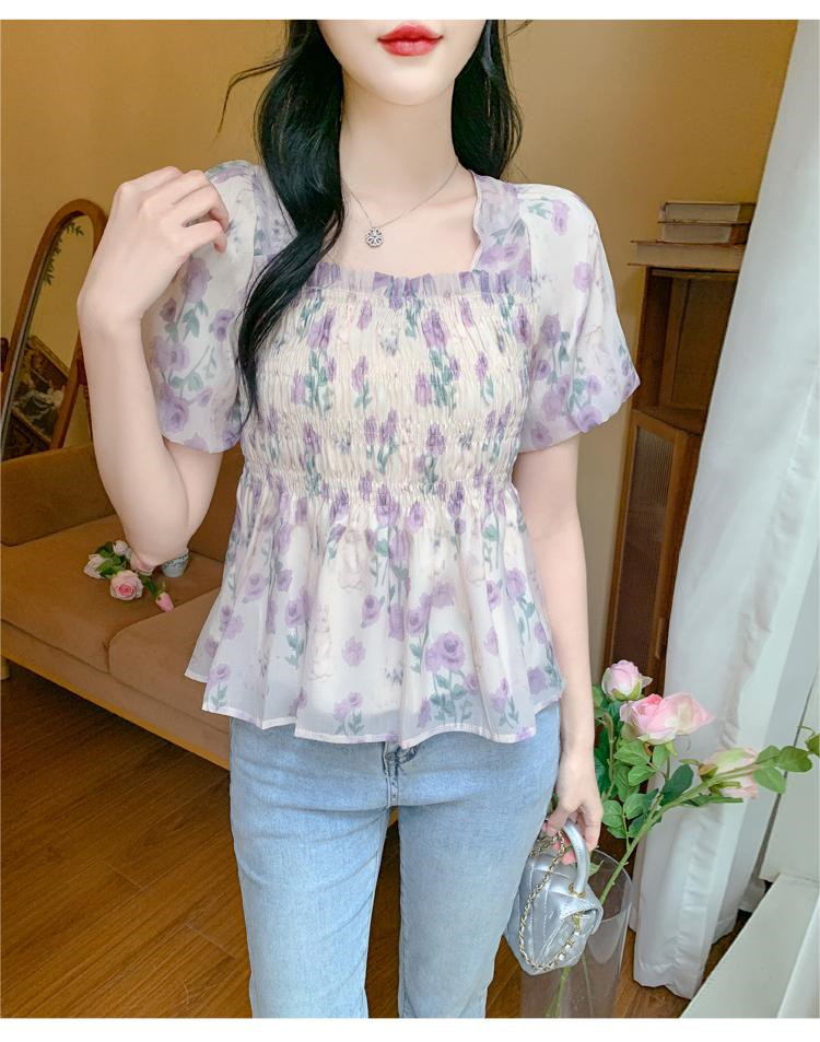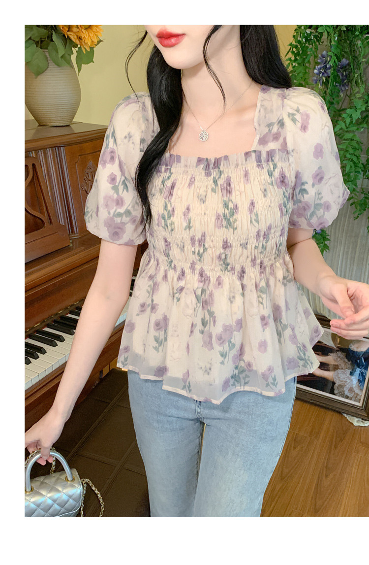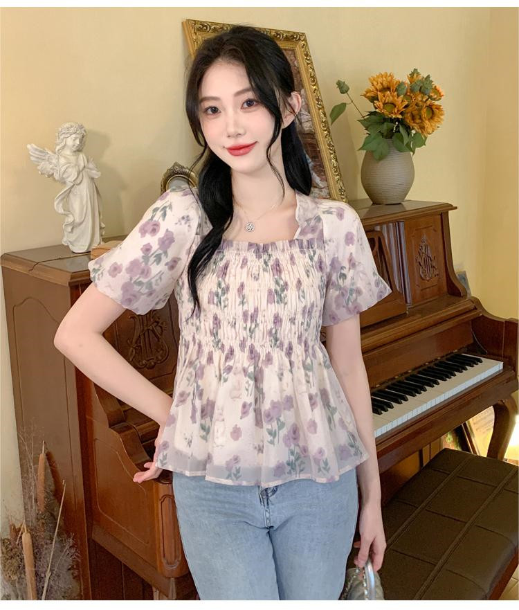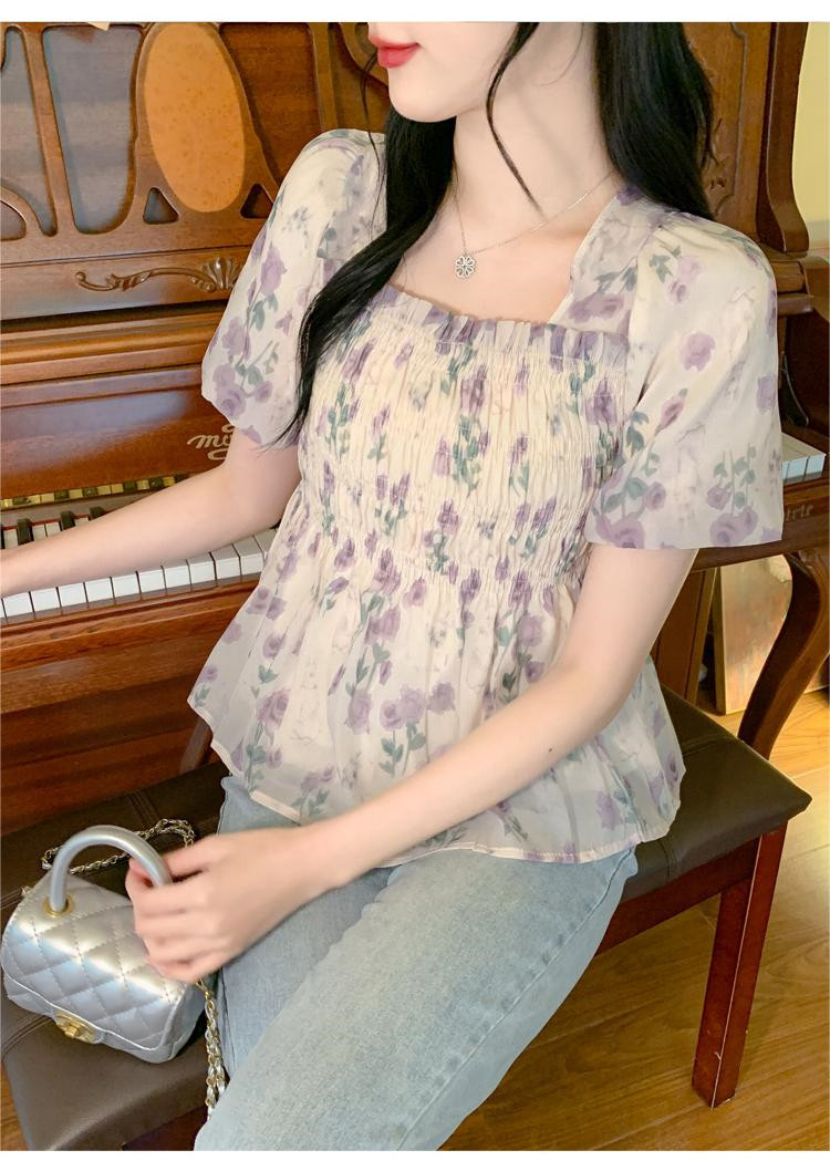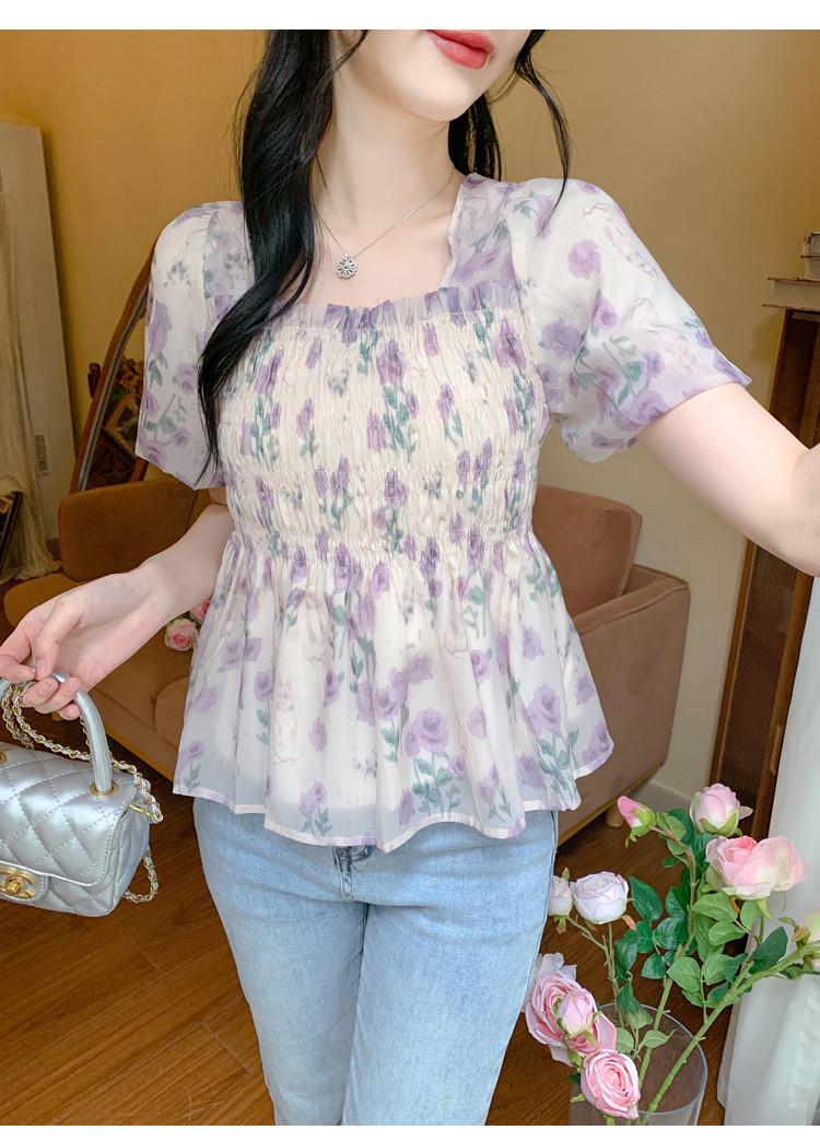 商品名 ブラウス レディース スクエアネック シフォンシャツ 花柄 総柄 ボリューム袖 半袖 プルオーバー かわいい