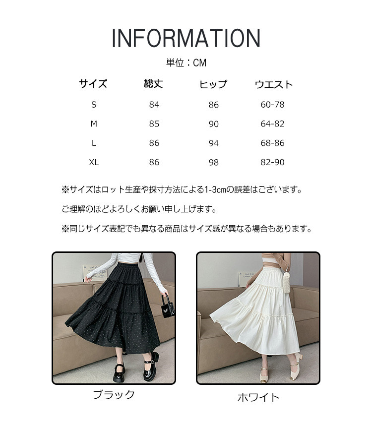 ※お取り扱い前に、商品付属タグの記載もご確認下さい。商品情報商品名 スカート レディース ボトムス ティアードスカート 裏地あり ウエストゴム ミモレ丈 可愛い カジュアル 夏素材 ポリエステルカラー ブラック|ホワイトサイズ S|M|L|XL生産国 中国包装について 環境保護の観点から、「簡易包装」を推進しております明細書について 当店ではエコロジーと個人情報流出防止のため、ご指示の無い限り明細書を発行しておりません。