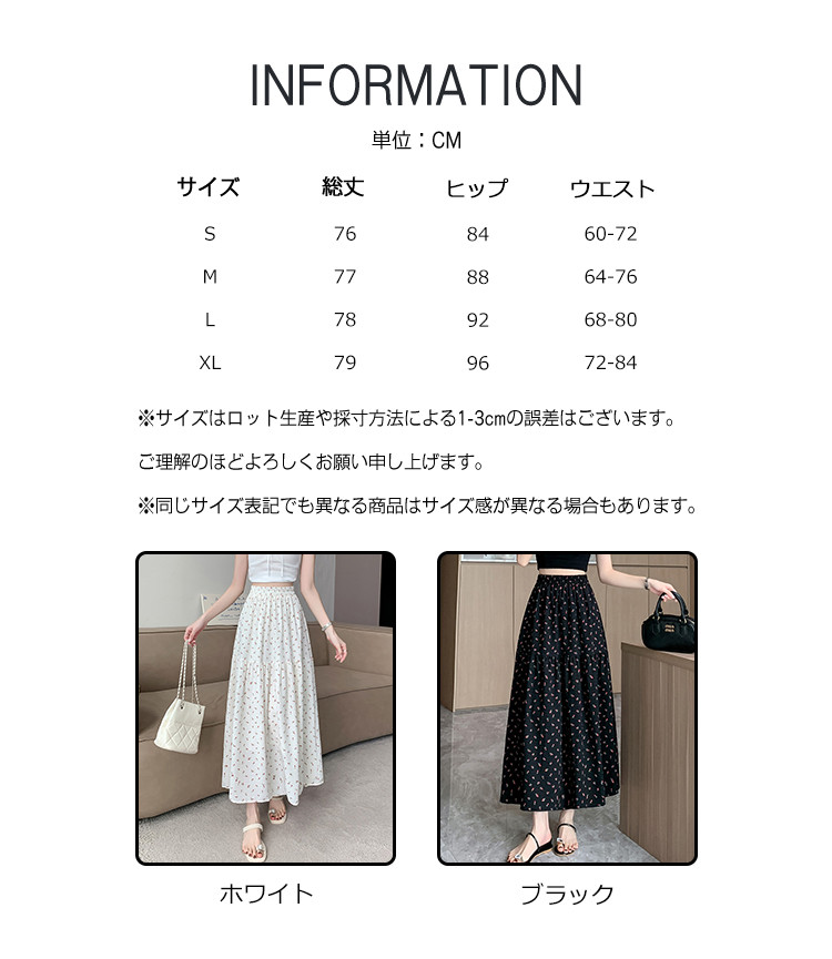 ※お取り扱い前に、商品付属タグの記載もご確認下さい。商品情報商品名 スカート レディース ボトムス 小花柄 アンクル丈 ウエストゴム ロングスカート 可愛い カジュアル 夏 夏物素材 ポリエステルカラー ブラック|ホワイトサイズ S|M|L|XL生産国 中国包装について 環境保護の観点から、「簡易包装」を推進しております明細書について 当店ではエコロジーと個人情報流出防止のため、ご指示の無い限り明細書を発行しておりません。