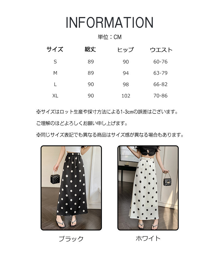 ※お取り扱い前に、商品付属タグの記載もご確認下さい。商品情報商品名 スカート レディース ボトムス 水玉 ウエストゴム アンクル ロングスカート Aライン フレア カジュアル素材 ポリエステルカラー ブラック|杏色サイズ S|M|L|XL生産国 中国包装について 環境保護の観点から、「簡易包装」を推進しております明細書について 当店ではエコロジーと個人情報流出防止のため、ご指示の無い限り明細書を発行しておりません。