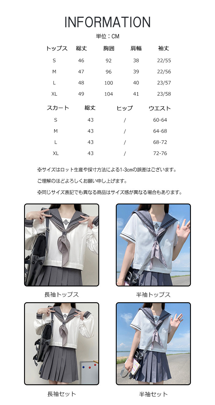 ※お取り扱い前に、商品付属タグの記載もご確認下さい。商品情報商品名 セーラー服 レディース 配色 トップス 上下セット 刺しゅう 刺繍 スクールウェア 制服 ショート丈 スカーフ素材 ポリエステルカラー 半袖トップス|半袖セット|長袖トップス|長袖セットサイズ S|M|L|XL生産国 中国包装について 環境保護の観点から、「簡易包装」を推進しております明細書について 当店ではエコロジーと個人情報流出防止のため、ご指示の無い限り明細書を発行しておりません。