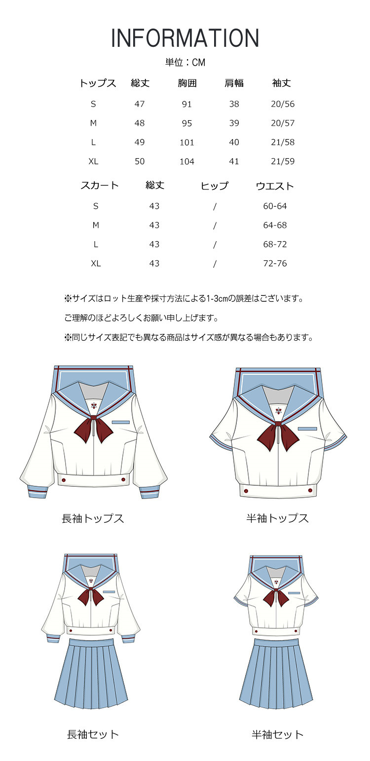 ※お取り扱い前に、商品付属タグの記載もご確認下さい。商品情報商品名 セーラー服 レディース 配色 トップス 上下セット 刺しゅう 刺繍 スクールウェア 制服 ショート丈 スカーフ素材 ポリエステルカラー 半袖トップス|半袖セット|長袖トップス|長袖セットサイズ S|M|L|XL生産国 中国包装について 環境保護の観点から、「簡易包装」を推進しております明細書について 当店ではエコロジーと個人情報流出防止のため、ご指示の無い限り明細書を発行しておりません。