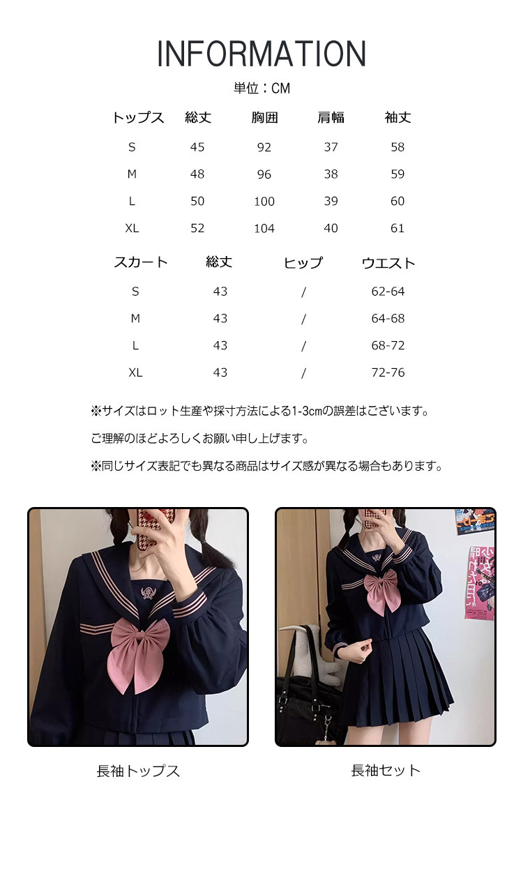 ※お取り扱い前に、商品付属タグの記載もご確認下さい。商品情報商品名 セーラー服 レディース 配色 トップス 上下セット 刺しゅう 刺繍 スクールウェア 制服 ショート丈 スカーフ素材 ポリエステルカラー 長袖トップス|長袖セットサイズ S|M|L|XL生産国 中国包装について 環境保護の観点から、「簡易包装」を推進しております明細書について 当店ではエコロジーと個人情報流出防止のため、ご指示の無い限り明細書を発行しておりません。
