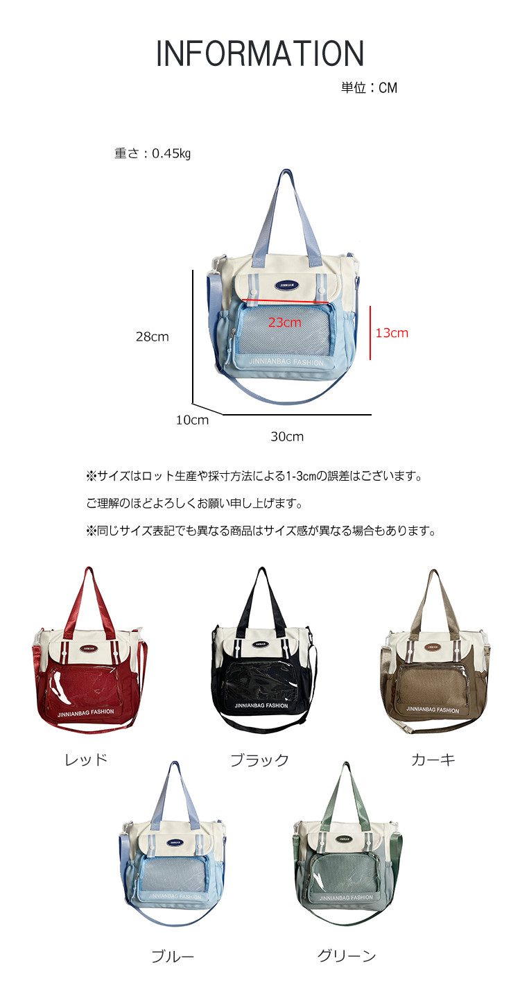 ※お取り扱い前に、商品付属タグの記載もご確認下さい。商品情報商品名 痛バッグ レディース ショルダーバッグ 大容量 缶バッチ クリアバッグ 痛バック 痛バ カジュアル おしゃれ素材 ナイロンカラー ブラック|グリーン|カーキ|ブルー|レッドサイズ F生産国 中国包装について 環境保護の観点から、「簡易包装」を推進しております明細書について 当店ではエコロジーと個人情報流出防止のため、ご指示の無い限り明細書を発行しておりません。