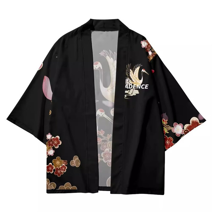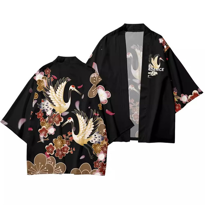ブラックツル鶴柄男女兼用 夏祭り 夏恋 寺 法被 羽織り 半纏 はんてん 法被 ハッピ 長半纏 半天 袢天 半被 お祭り衣装 雅 和柄 羽織 和装 ユニセックス 浴衣 着物 はっぴスタイル かっこいい